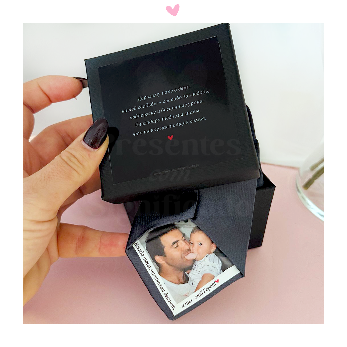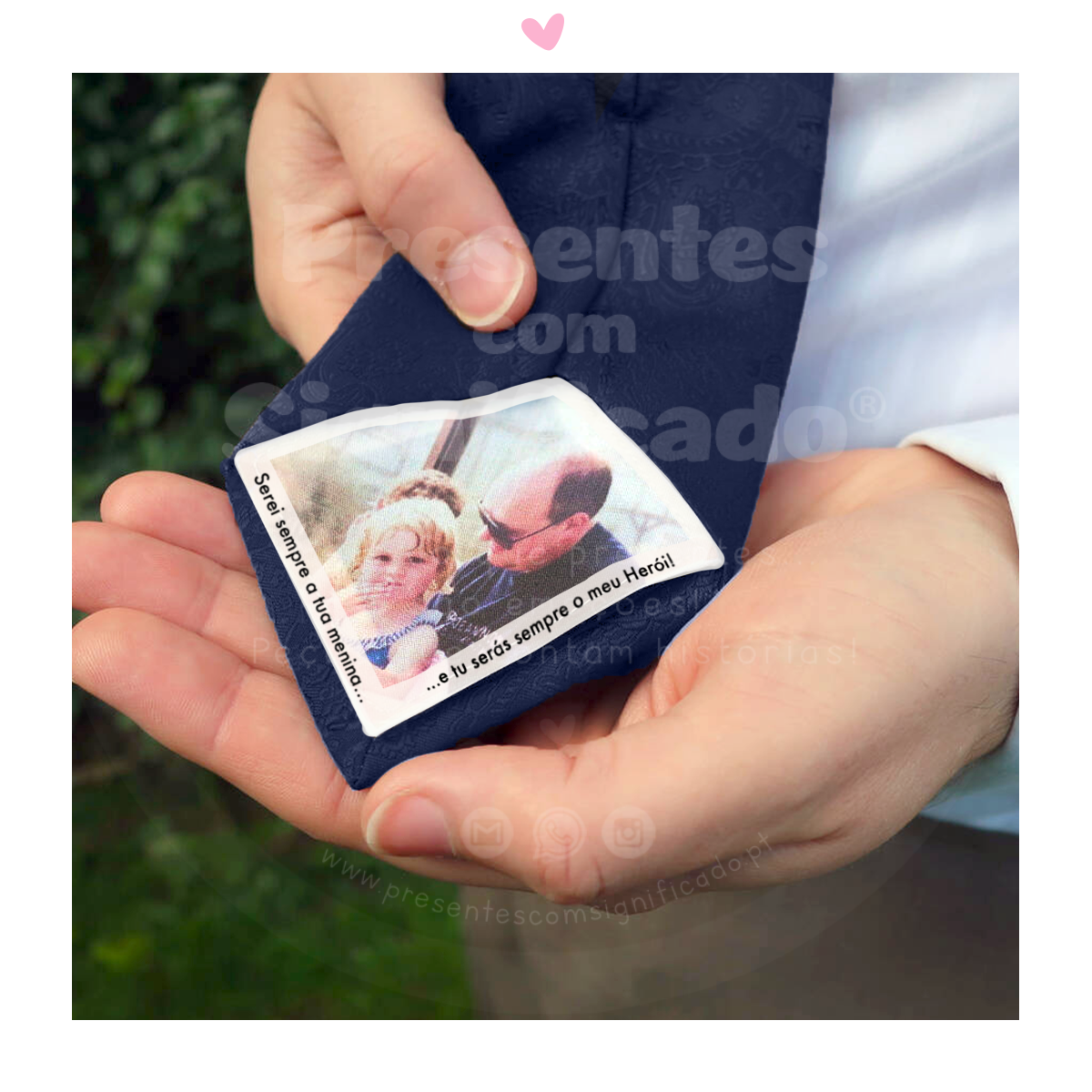 Gravata em cetim personalizada com foto e texto. A estampagem é feita na ponta maior, do lado interior, ficando apenas visível para quem usa. Por este motivo, torna-se o presente ideal para usar tanto no dia-a-dia, como em ocasiões especiais, tais como casamentos.