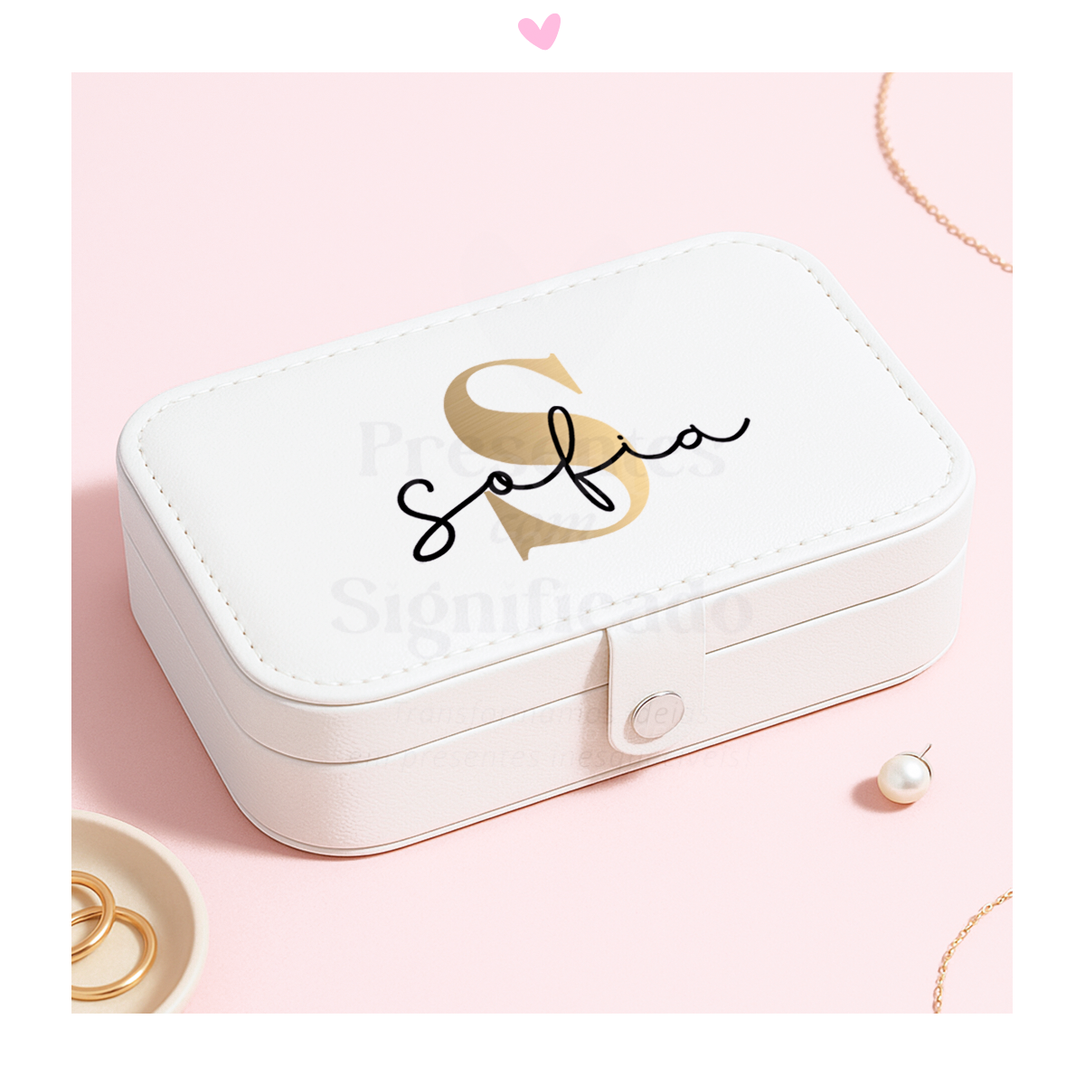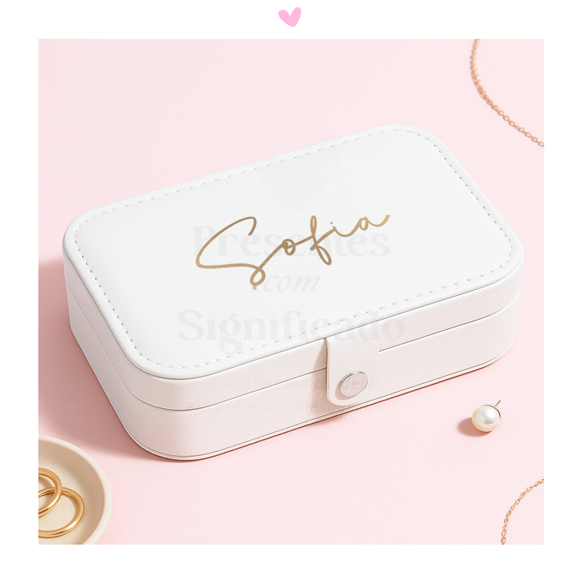 Guarda-jóias em pele sintética branca com divisórias para guardar anéis, brincos, colares... Personalizado com nome, palavra, data ou texto até um máximo de 5 palavras.