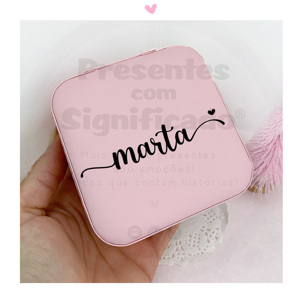 Mini Guarda-jóias em pele sintética cor rosa com divisórias para guardar anéis, brincos, colares... Personalizado com nome, data ou texto até um máximo de 5 palavras.