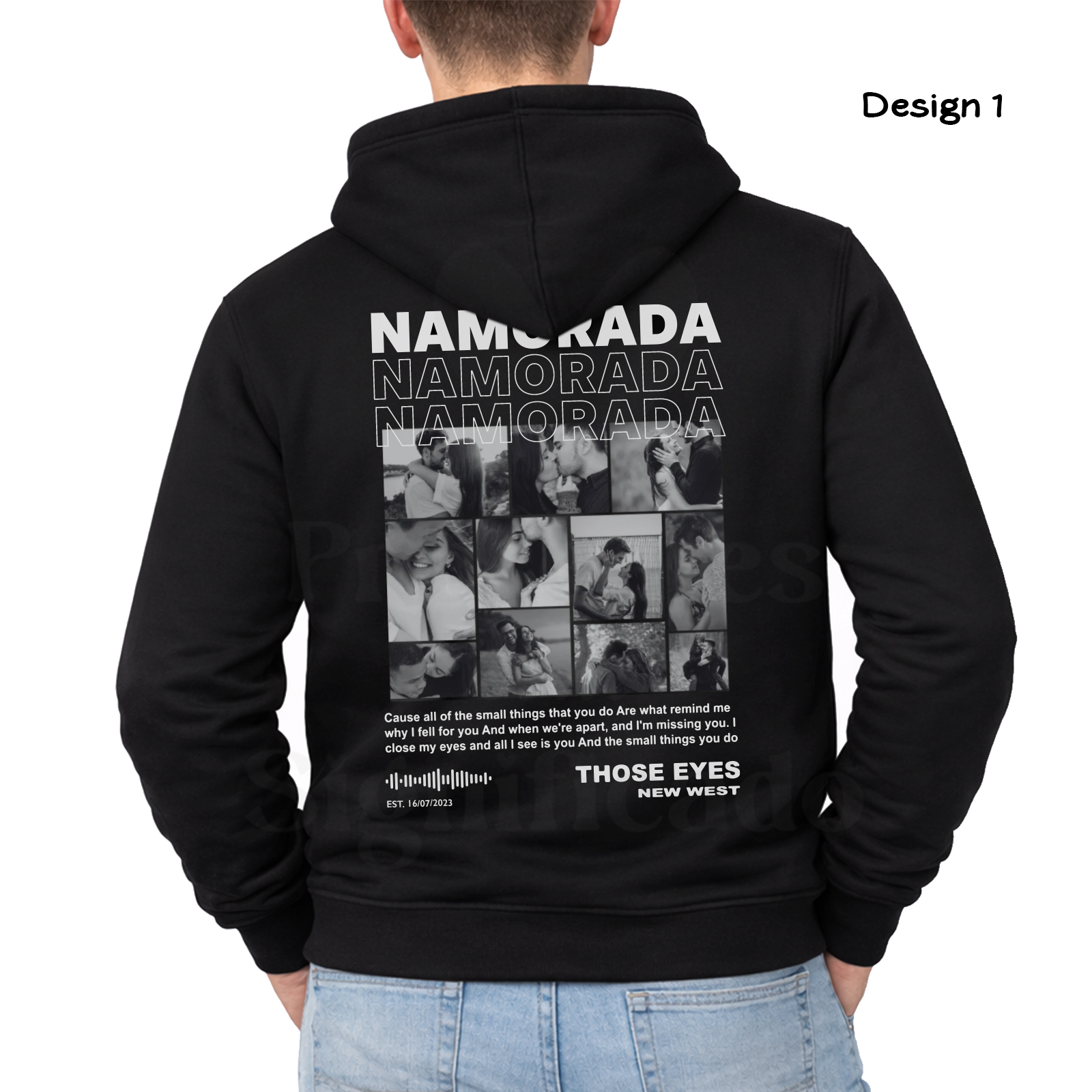Sweatshirt (lisa, SEM capuz) ou Hoodie (COM capuz e bolso frontal) em algodão e poliéster de 300g. Tecido cardado por dentro com punhos e cós reforçado. Personalizado atrás com palavra a gosto (Ex: Namorada, Only You, Forever, Always...) as vossas fotos (a preto e branco)**, excerto da vossa música e data especial. Se pretender uma frase ou excerto da música em específico, indique no campo dos detalhes a adicionar/alterar.