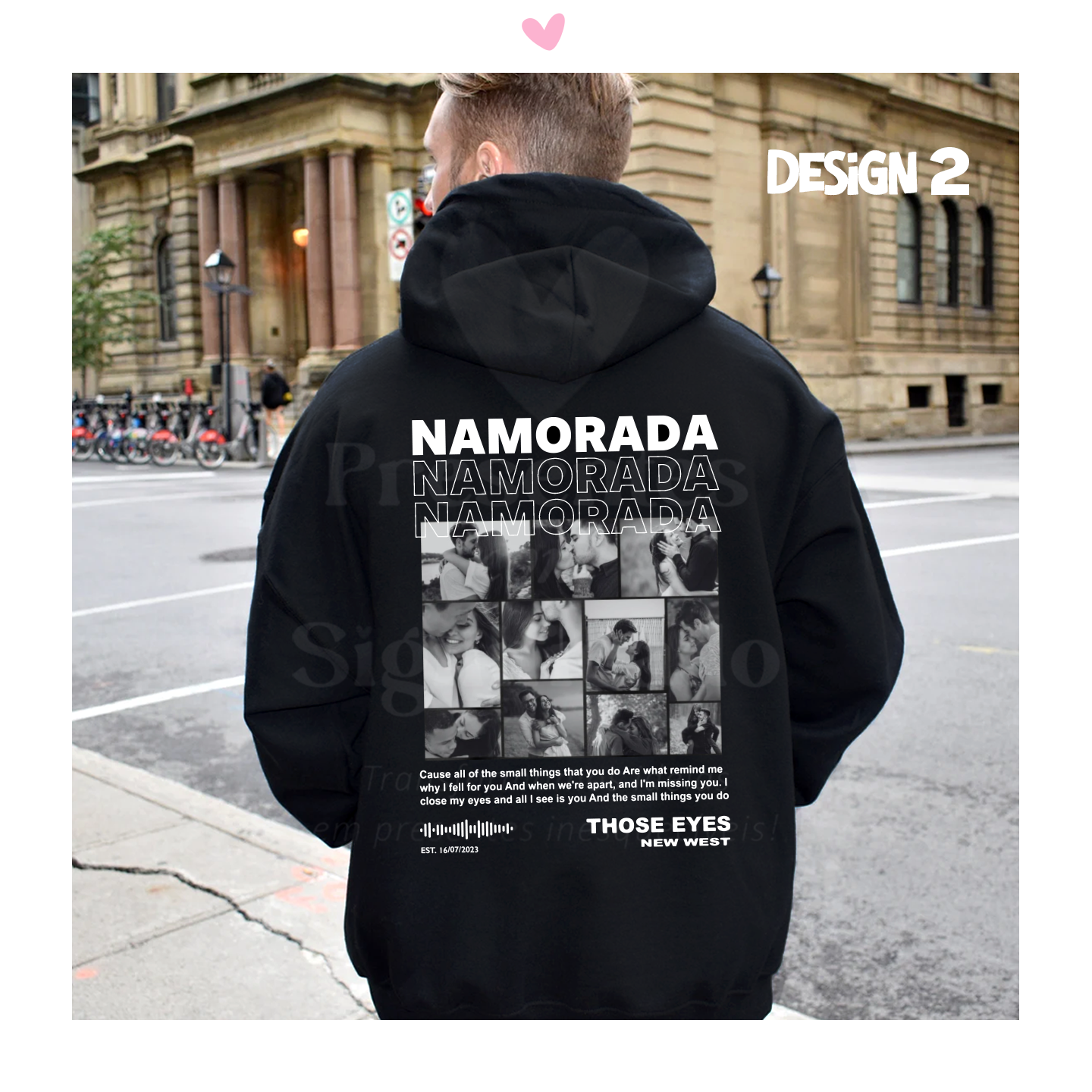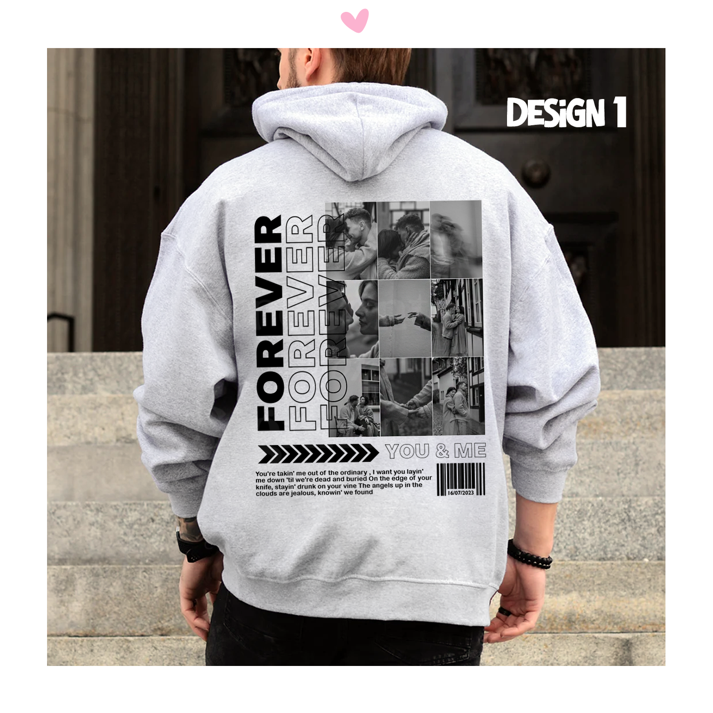 Hoodie (com capuz e bolso frontal) em algodão e poliéster de 290g. Tecido ligeiramente cardado por dentro com punhos e cós reforçado. Personalizado atrás com palavra a gosto (Ex: Namorada, Only You, Forever, Always...) as vossas fotos (a preto e branco)**, excerto da vossa música e data especial. Se pretender uma frase ou excerto da música em específico, indique no campo dos detalhes a adicionar/alterar.
