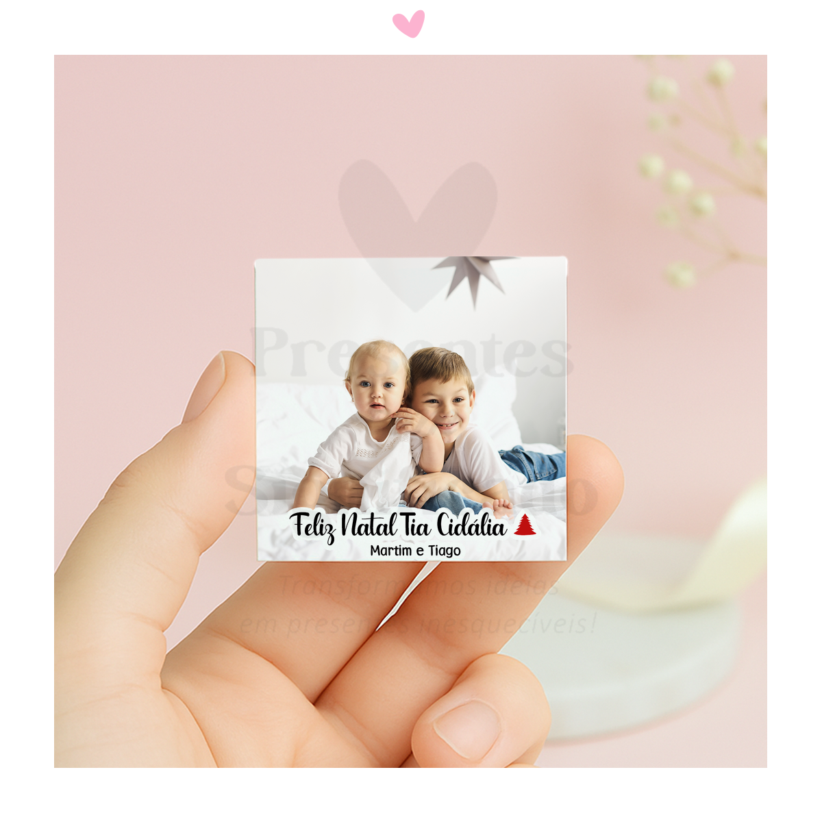Íman resinado maleável (não quebra) tamanho 5x5cm c/ foto e texto a gosto.