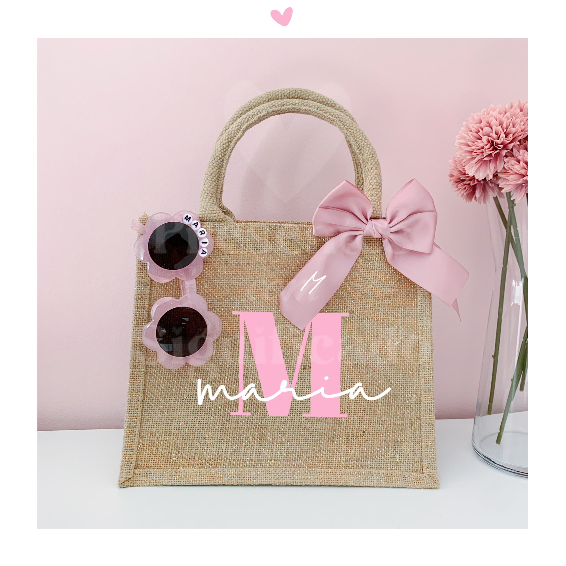 Kit para menina das alianças (daminha de honor). O kit inclui artigos para usar no dia do evento com óculos de criança, laço de cabelo (com inicial) e mini saco em ráfia (personalizado com nome e inicial). É possível colocar o kit dentro de uma caixa com um pedido/dedicatória em formato cartão-postal.
