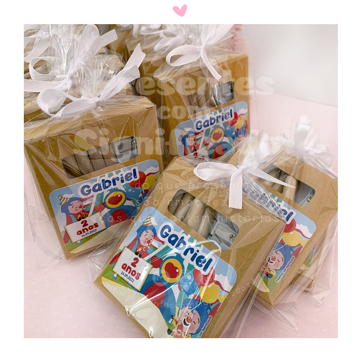 Sugestão de miminho para os mais pequenos em qualquer evento. Caixa de cartão kraft c/ 6 lápis de cor + afia + mini-bloco c/ 20 desenhos para colorir. Personalizamos com o tema que quiser.
