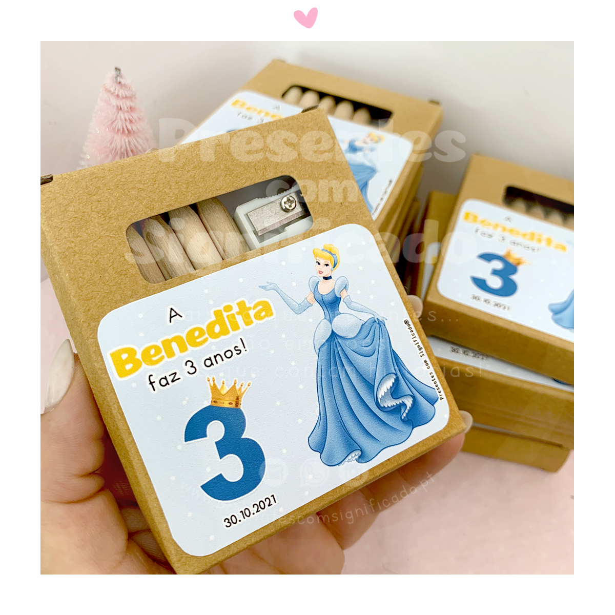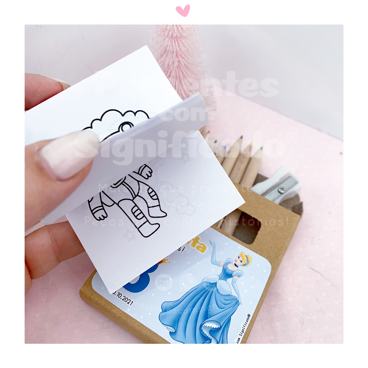 Sugestão de miminho para os mais pequenos em qualquer evento. Caixa de cartão kraft c/ 6 lápis de cor + afia + mini-bloco c/ 20 desenhos para colorir. Personalizamos com o tema que quiser.