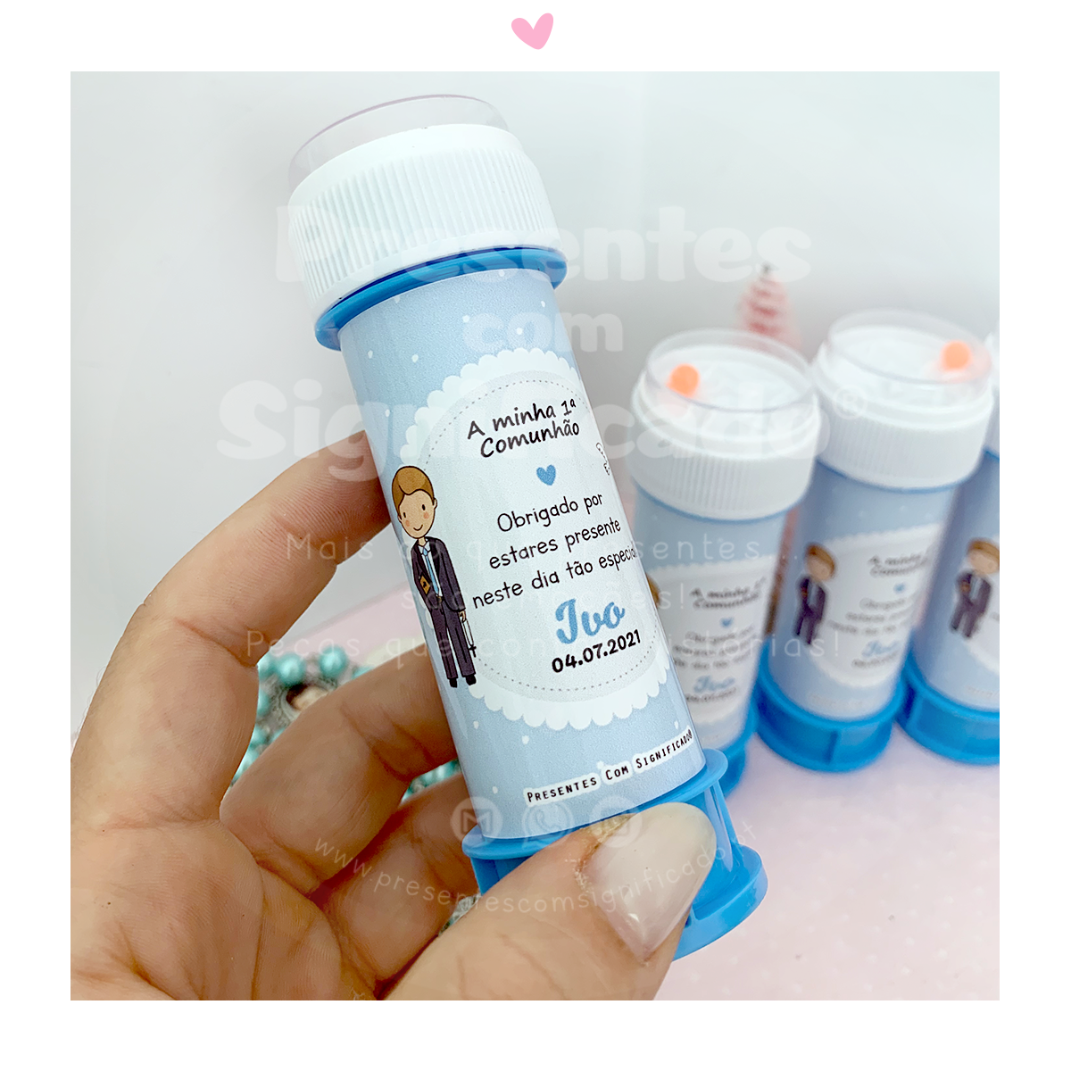 Sugestão de miminho para os mais pequenos em qualquer evento. Tubo de bolas de sabão para os mais pequenos se divertirem. Inclui líquido. Personalizamos com o tema que quiser.