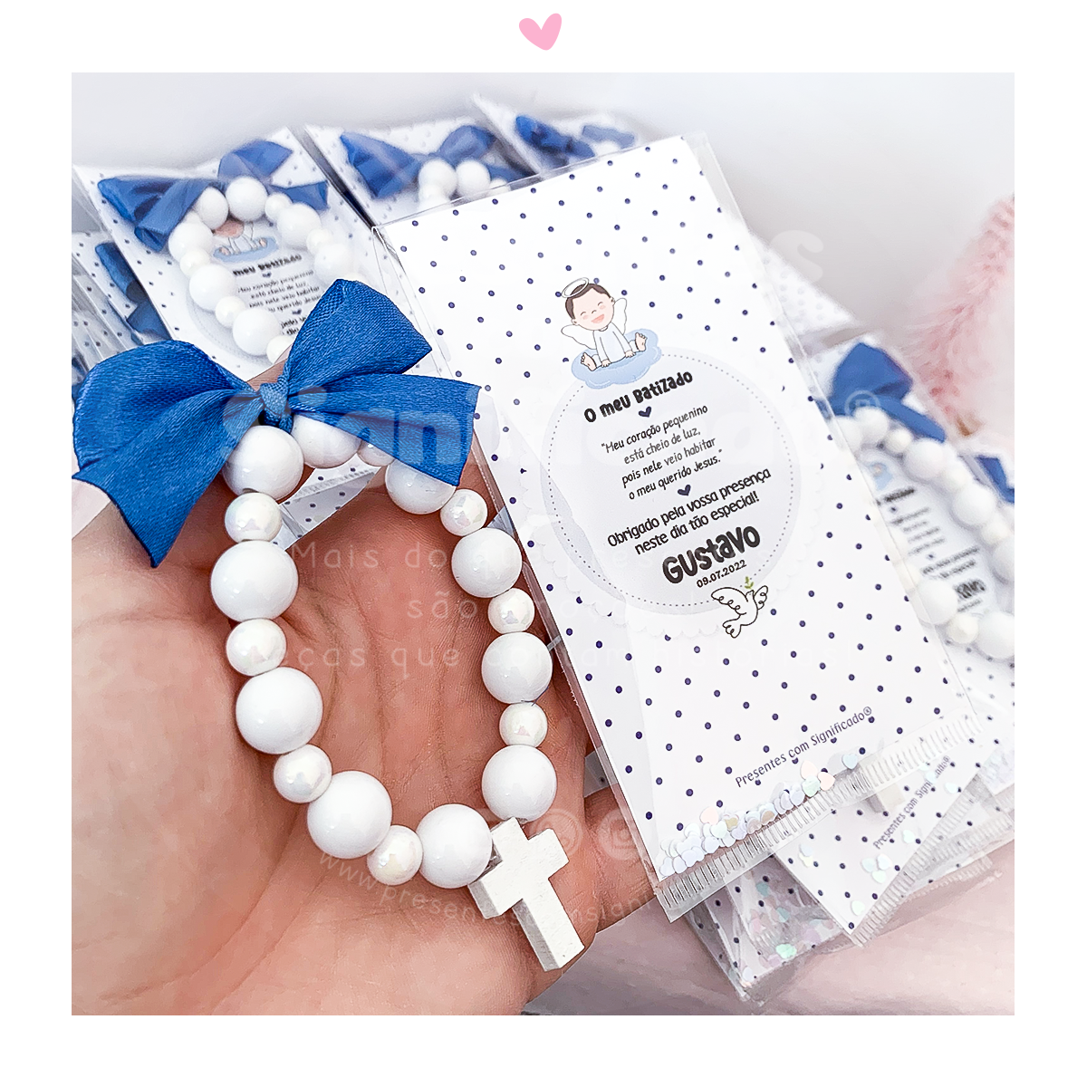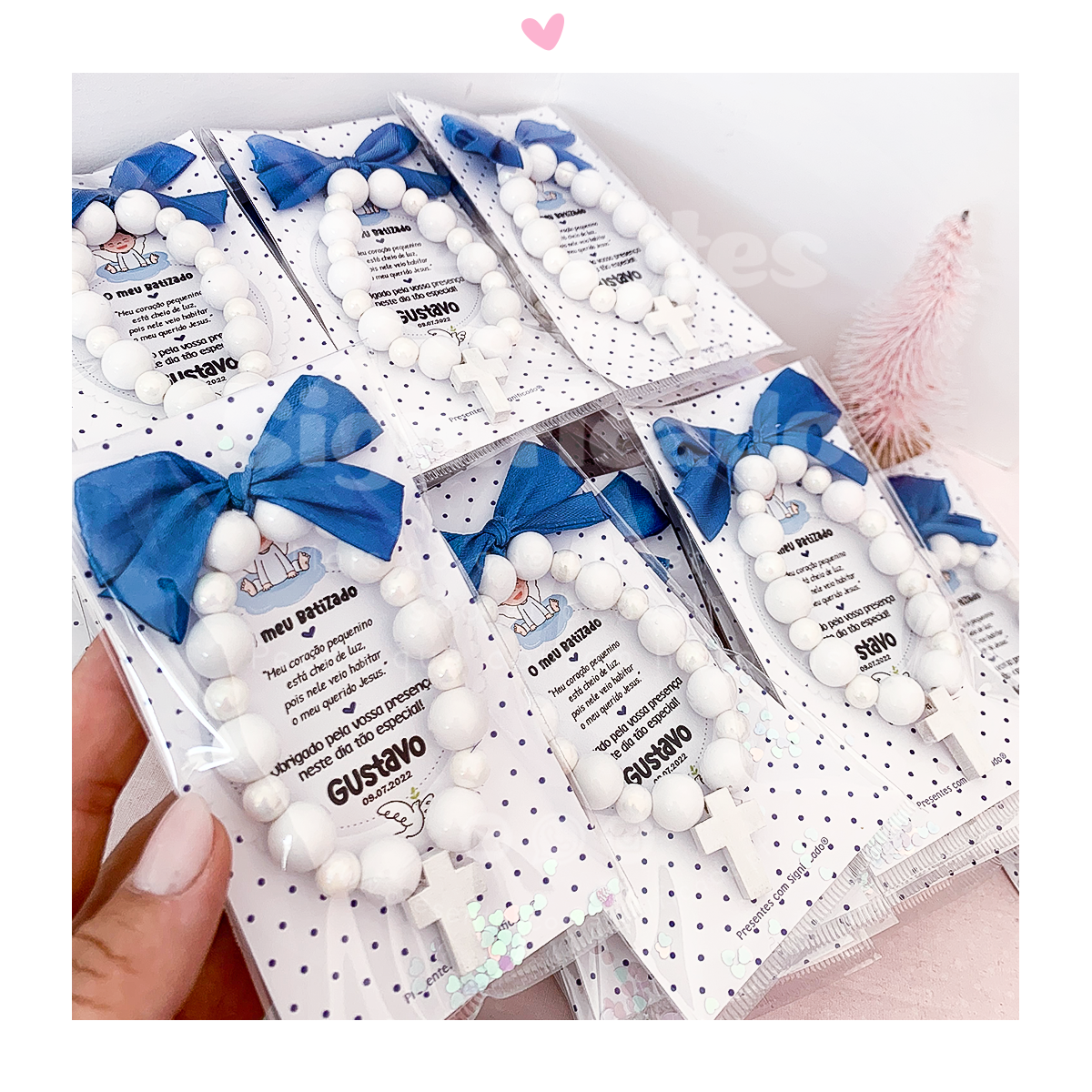 Sugestão de lembrança ideal para Batizado ou outro sacramento. Dezena c/ bolas redondas acrílicas, cruz de madeira e laço decorativo. Temos várias opções de embalamento (pacote transparente ou latinha de alumínio ambos com agradecimento) e várias cores.