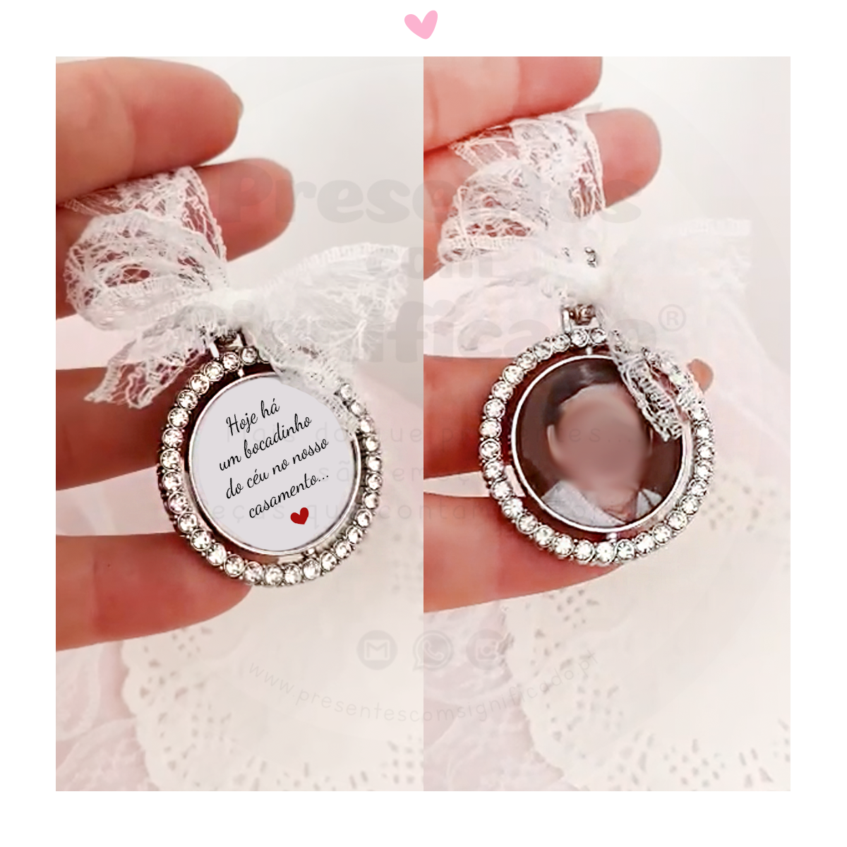 Medalha para ramo de noiva(bouquet) ou ramo de solteira - modelo c/ strass à volta. A medalha tem um eixo giratório ao centro, podendo assim personalizá-la com uma foto na frente e um texto no verso ou duas fotos (uma em cada lado).