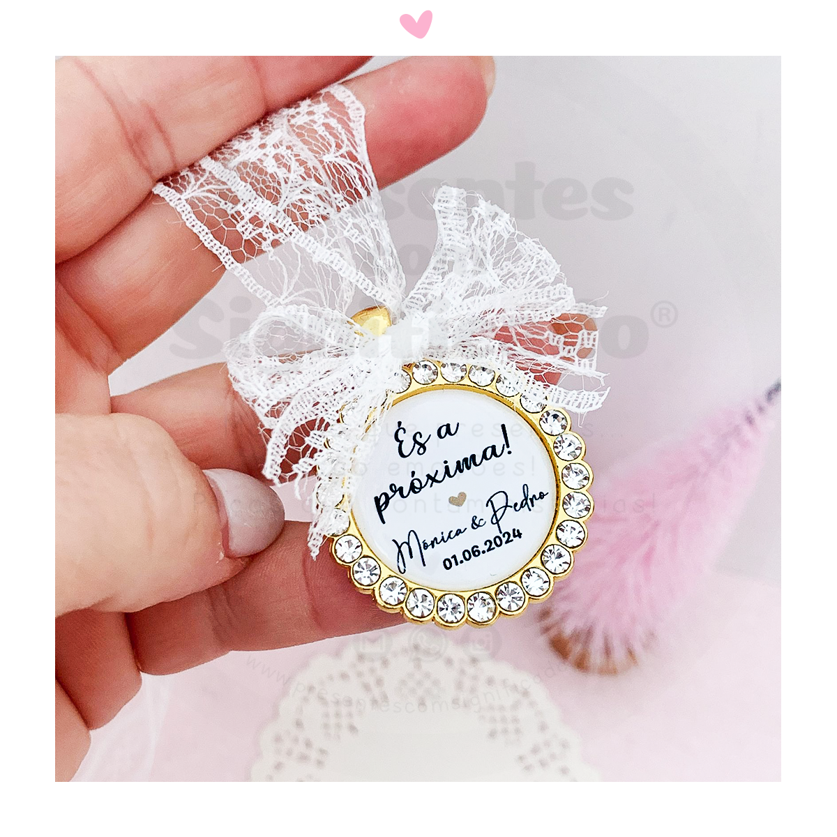 Medalha para ramo de noiva (bouquet) ou ramo de solteira - modelos redondos c/ strass à volta. Pode personalizar a medalha com uma foto OU um texto (não é possível colocar ambos nem fazer frente e verso nestes modelo). A medalha prende com fita de renda.