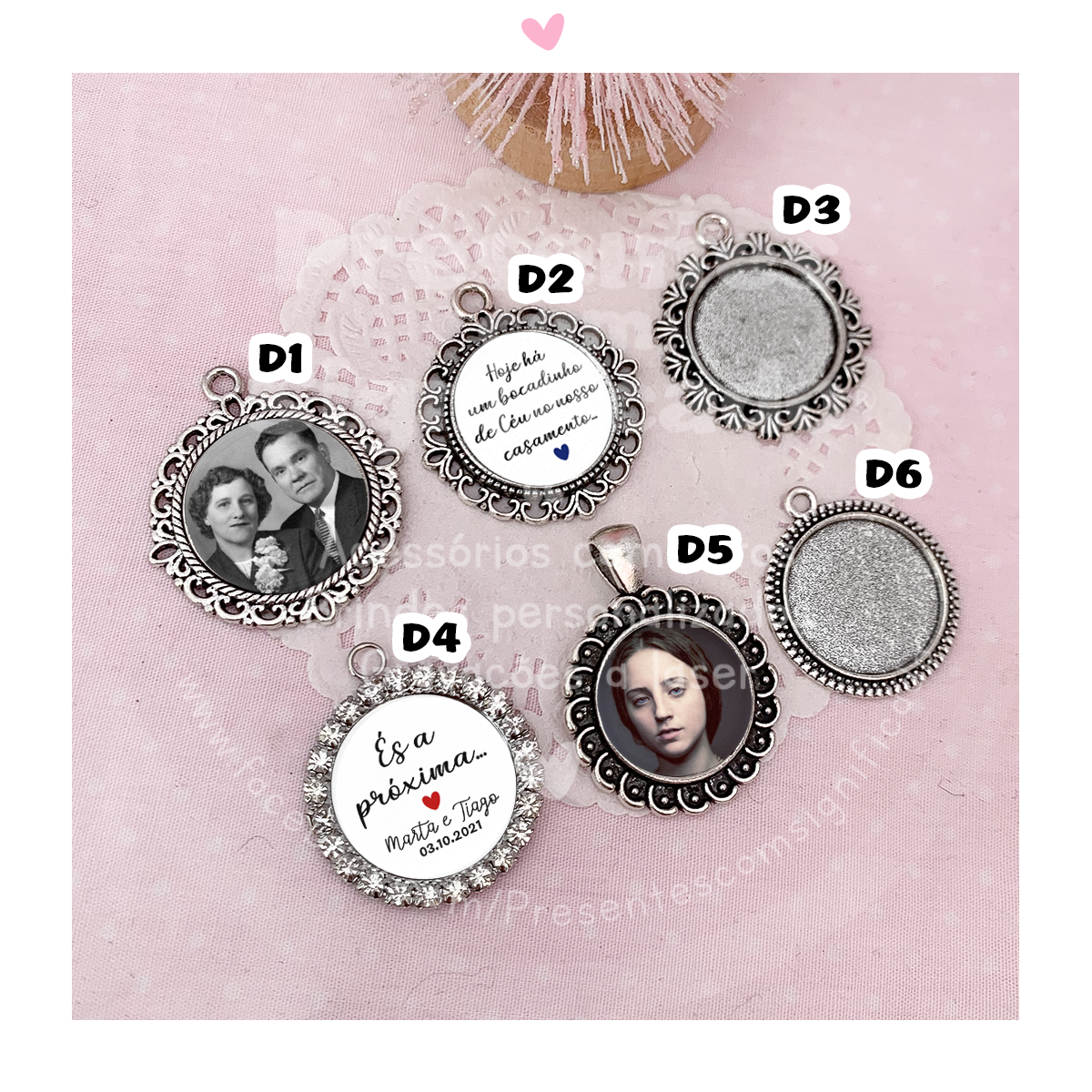 Medalha para ramo de noiva (bouquet) ou ramo de solteira - modelos redondos. Pode personalizar a medalha com uma foto OU um texto. Alguns modelos podem ser feitos frente e verso (podendo colocar a foto na frente e o texto no verso).