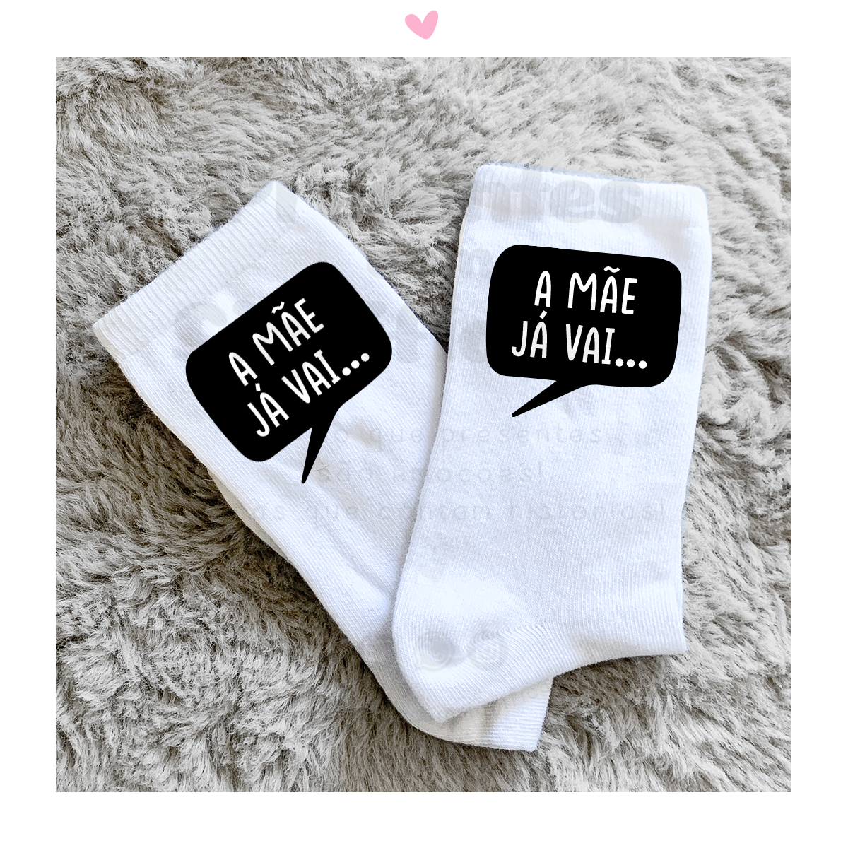 Par de meias brancas personalizadas com texto "A mãe já vai!". Personalizadas na zona lateral da canela  (área aproximada de 6x6cm).