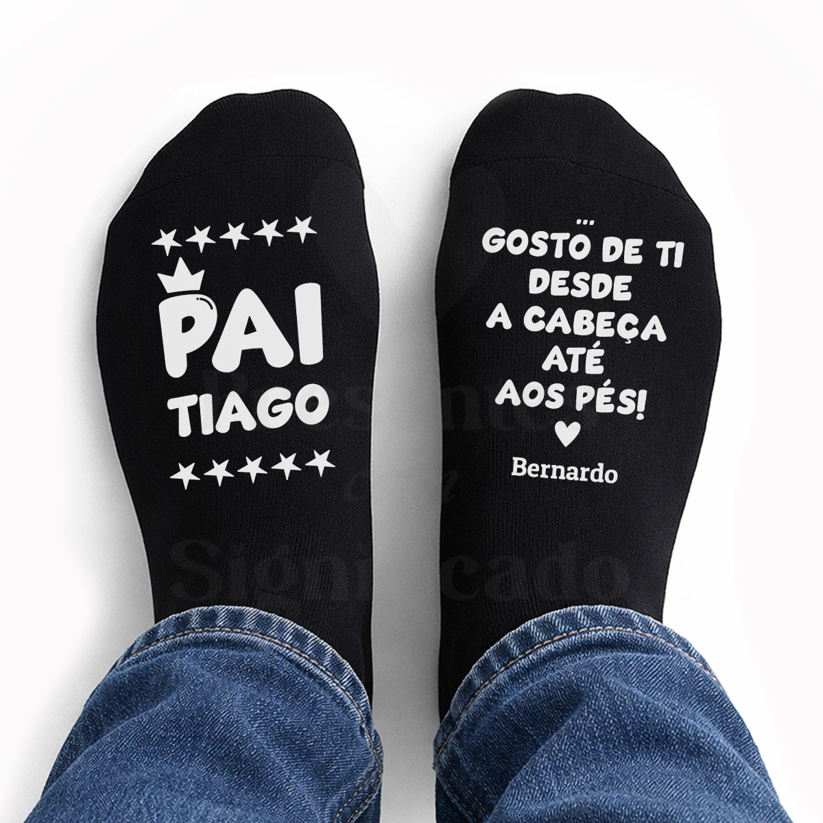 Par de meias personalizadas com texto "Pai X, gosto de ti desde a cabeça até aos pés!". Estampadas no peito do pé (área aproximada de 12x6cm). Adaptável para avô, tio, padrinho...