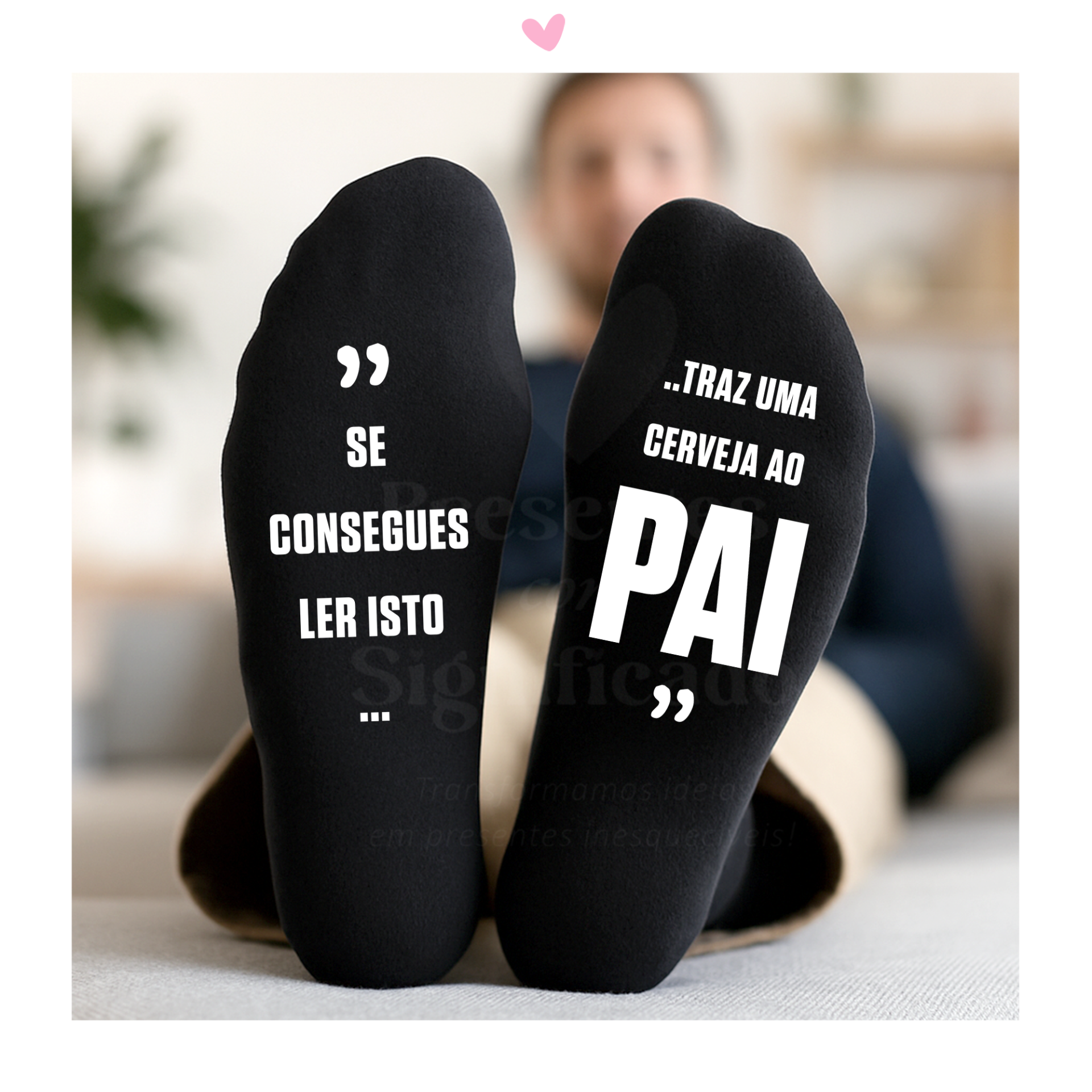 Par de meias personalizadas com texto "Se consegues ler isto... traz uma cerveja ao Pai". Um presente útil e original. Personalizadas na sola do pé (área aproximada de 12x6cm), estas meias são o presente ideal para oferecer em qualquer ocasião.