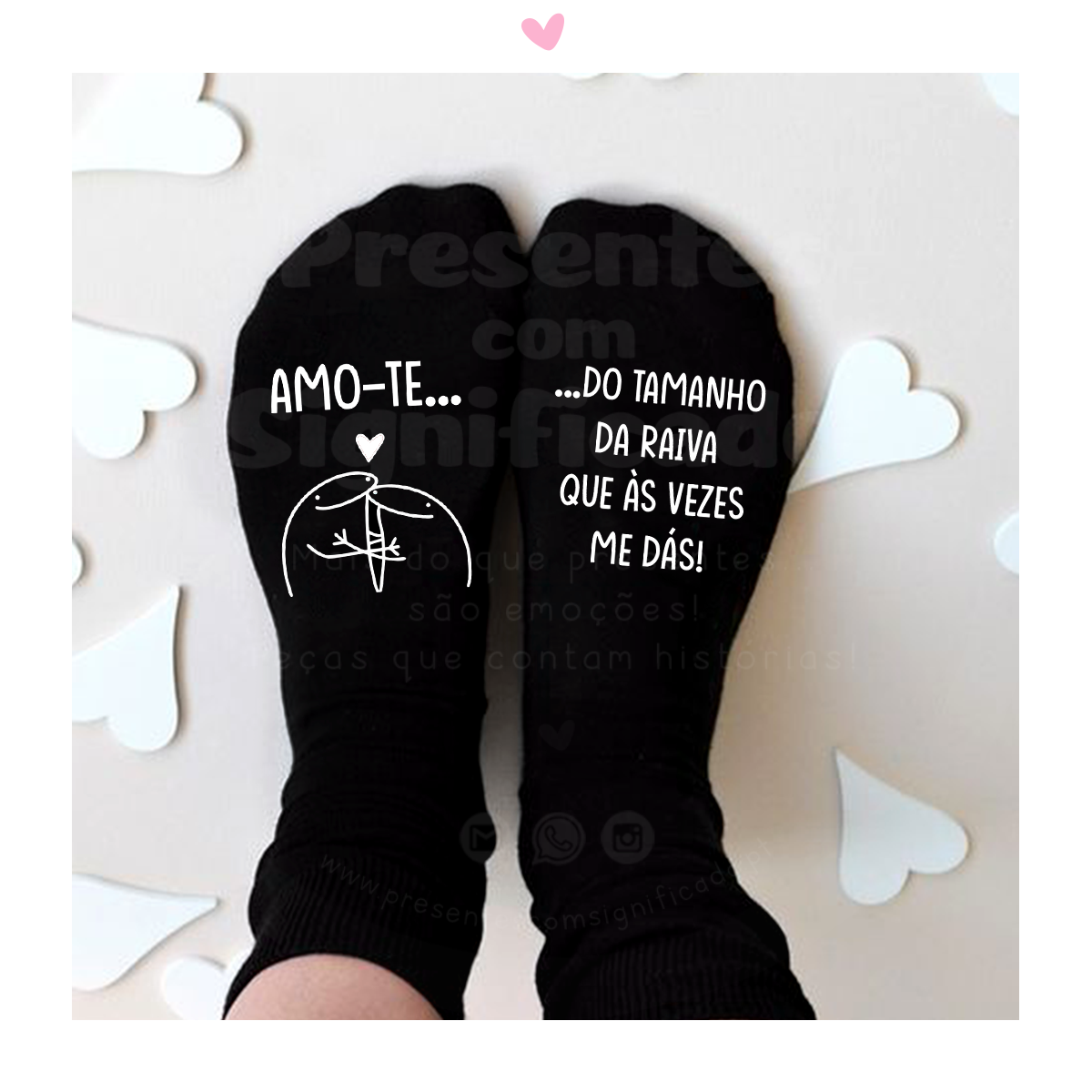 Par de meias personalizadas com frase "Amo-te... do tamanho da raiva que às vezes me dás!" Um presente sempre útil e muito original. Estampadas na sola do pé (área aproximada de 12x6cm).