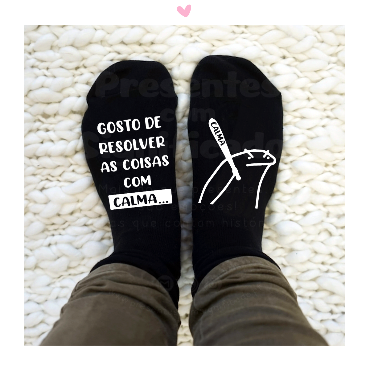 Par de meias personalizadas com frase "Gosto de resolver as coisas com calma..." Um presente sempre útil e muito original. Personalizadas na sola do pé (área aproximada de 12x6cm).