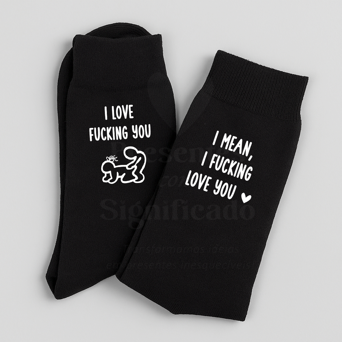 Par de meias personalizadas com texto "I love fucking you... I mean, I fucking love you" Personalizadas na zona lateral da canela (área aproximada de 6x6cm), estas meias são o presente ideal para a sua cara metade sorrir com este presente maroto :)