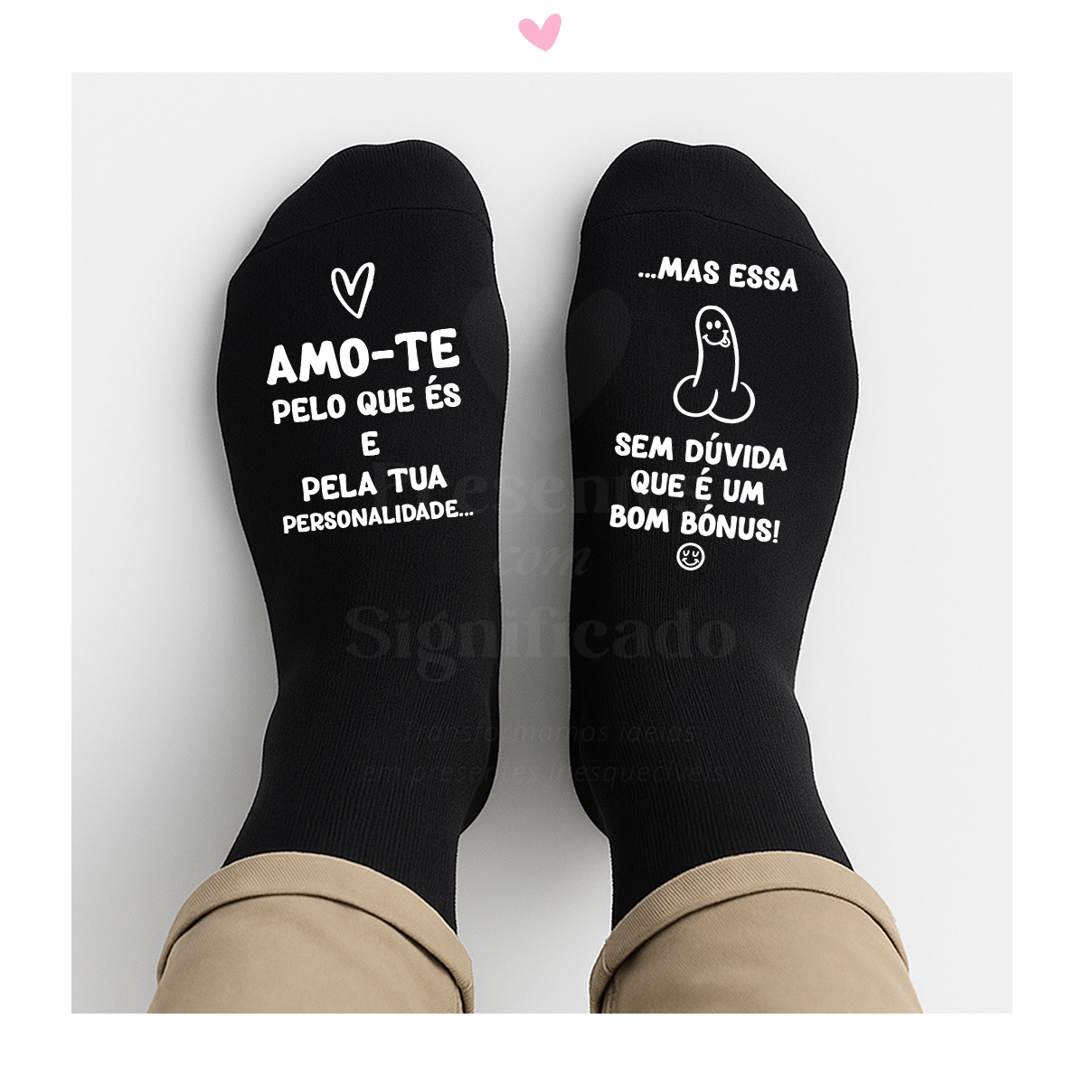 Par de meias personalizadas com frase "Amo-te pelo que és e pela tua personalidade... Mas essa p**a sem dúvida que é um bom bónus! " Estampadas no peito do pé (área aproximada de 11x6cm). Estas meias são o presente ideal para a sua cara metade sorrir com este presente maroto :)