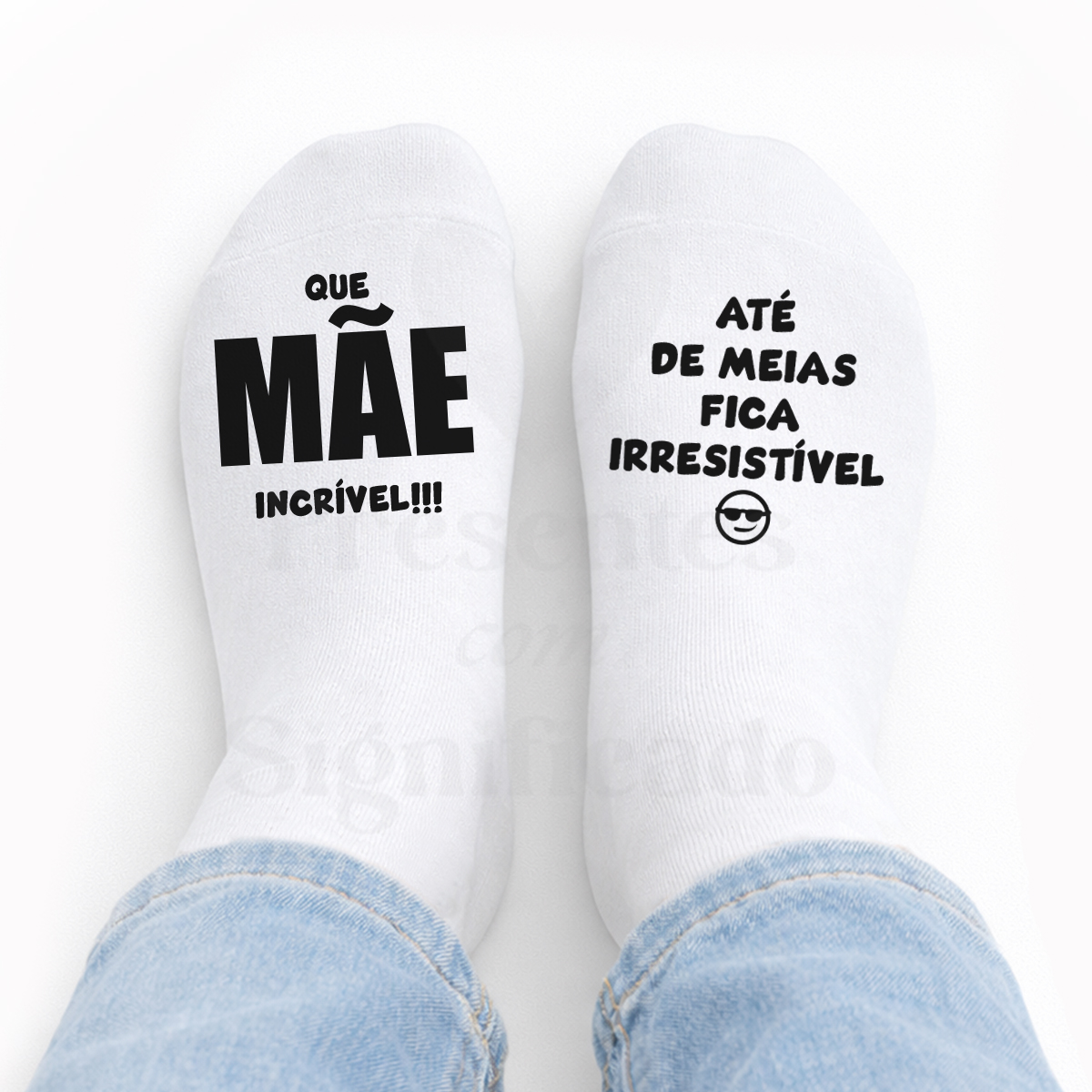 Par de meias personalizadas texto "Que Mãe incrível! Até de meias fica irresistível". Adaptável para Tia, Avó, Madrinha, etc... Estampadas no peito do pé (área aproximada de 12x6cm).