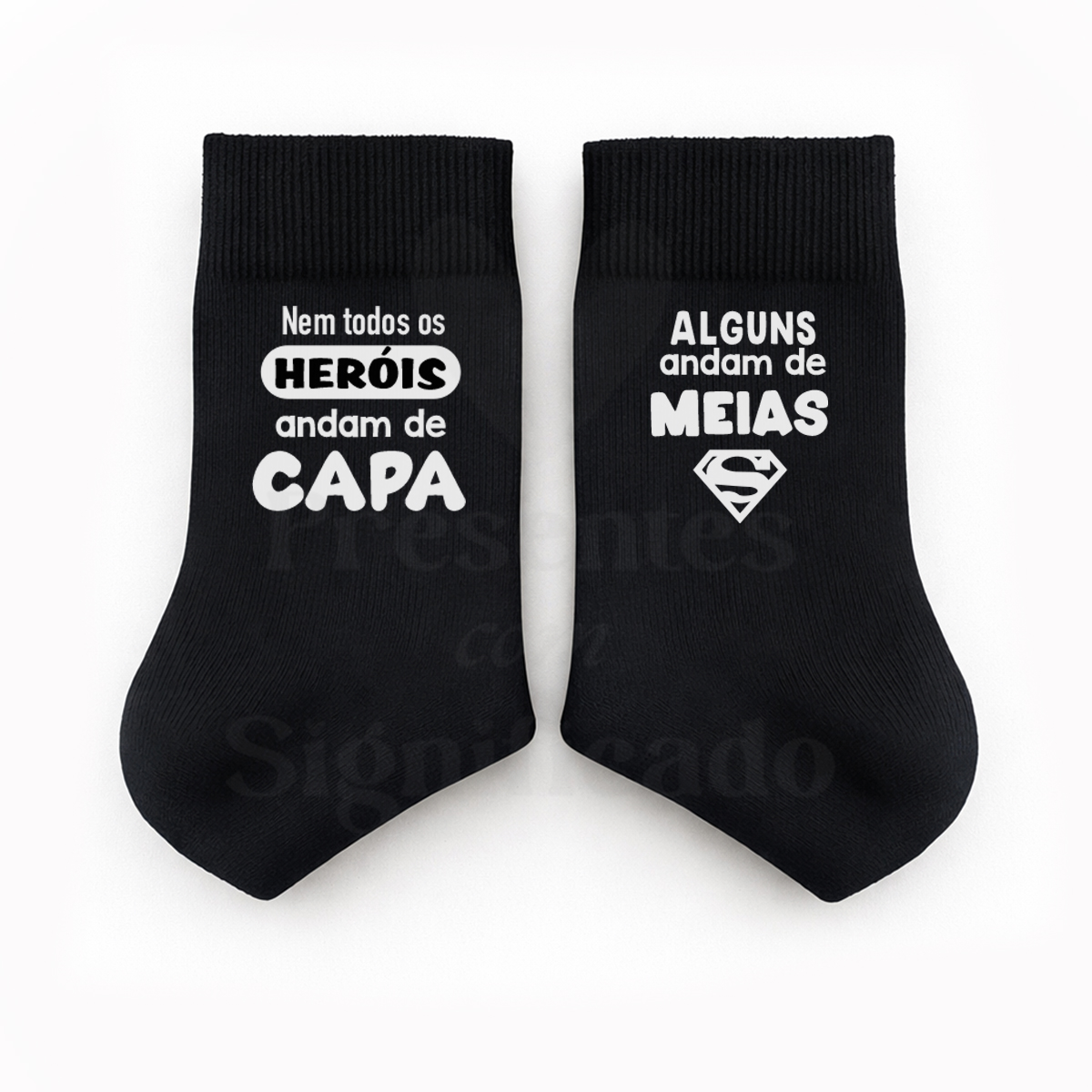 Par de meias personalizadas com frase "Nem todos os heróis andam de capa... alguns andam de meias!". Personalizadas na zona lateral da canela (área aproximada de 6x6cm).