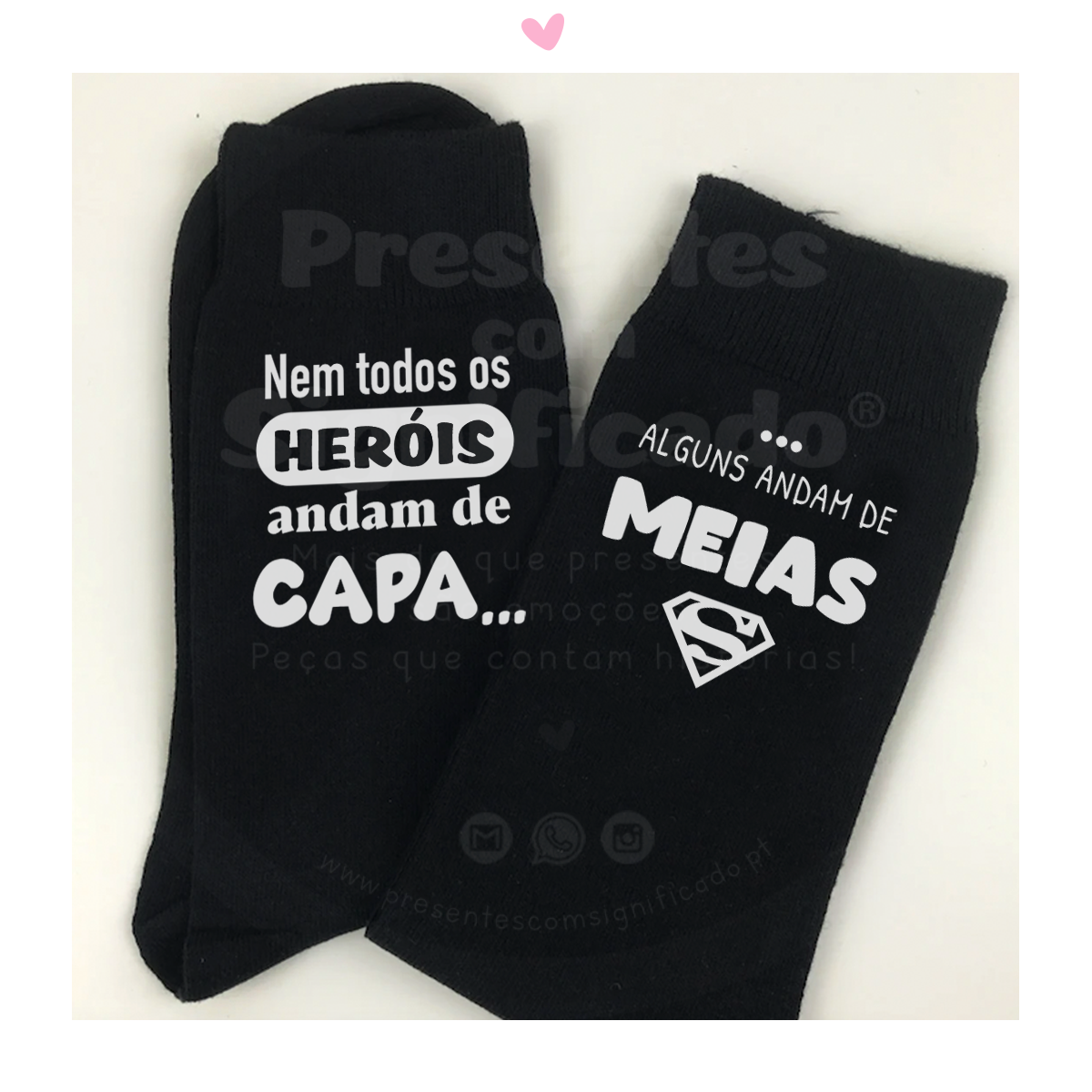 Par de meias personalizadas com frase "Nem todos os heróis andam de capa... alguns andam de meias!". Um presente útil e original. Personalizadas na zona lateral da canela  (área aproximada de 6x6cm), estas meias são o presente ideal em qualquer ocasião.
