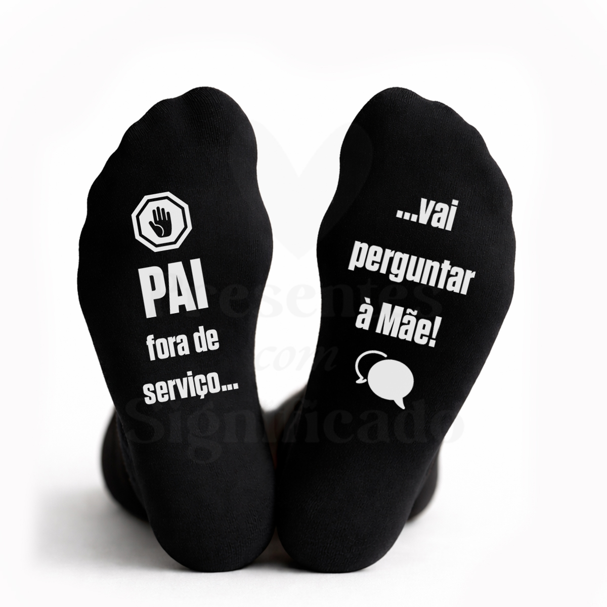 Par de meias personalizadas com frase "Pai fora de serviço... vai perguntar à Mãe!". Personalizadas na sola do pé (área aproximada de 12x6cm).