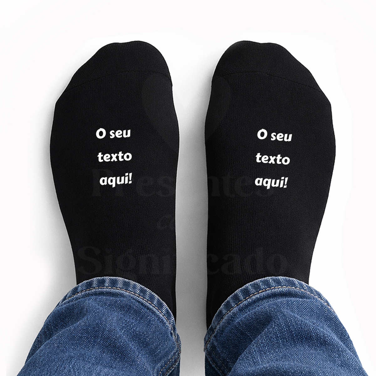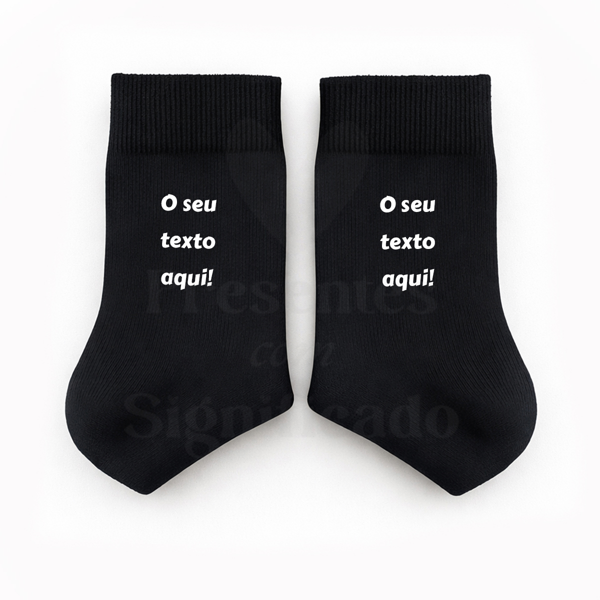 Par de meias personalizadas com texto a seu gosto. Podemos estampar na zona lateral da canela (área aproximada de 6x6cm) ou então no peito ou sola do pé (área aproximada de 12x6m).