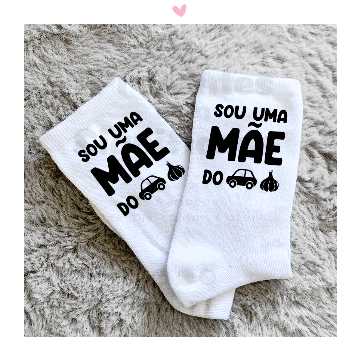 Par de meias brancas personalizadas com texto "Sou uma mãe do c*r*lho!". Personalizadas na zona lateral da canela  (área aproximada de 6x6cm).