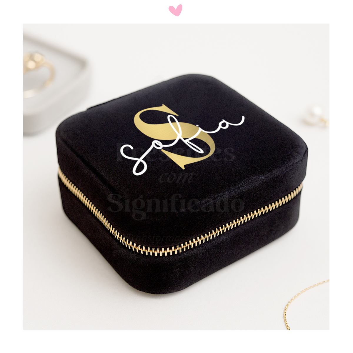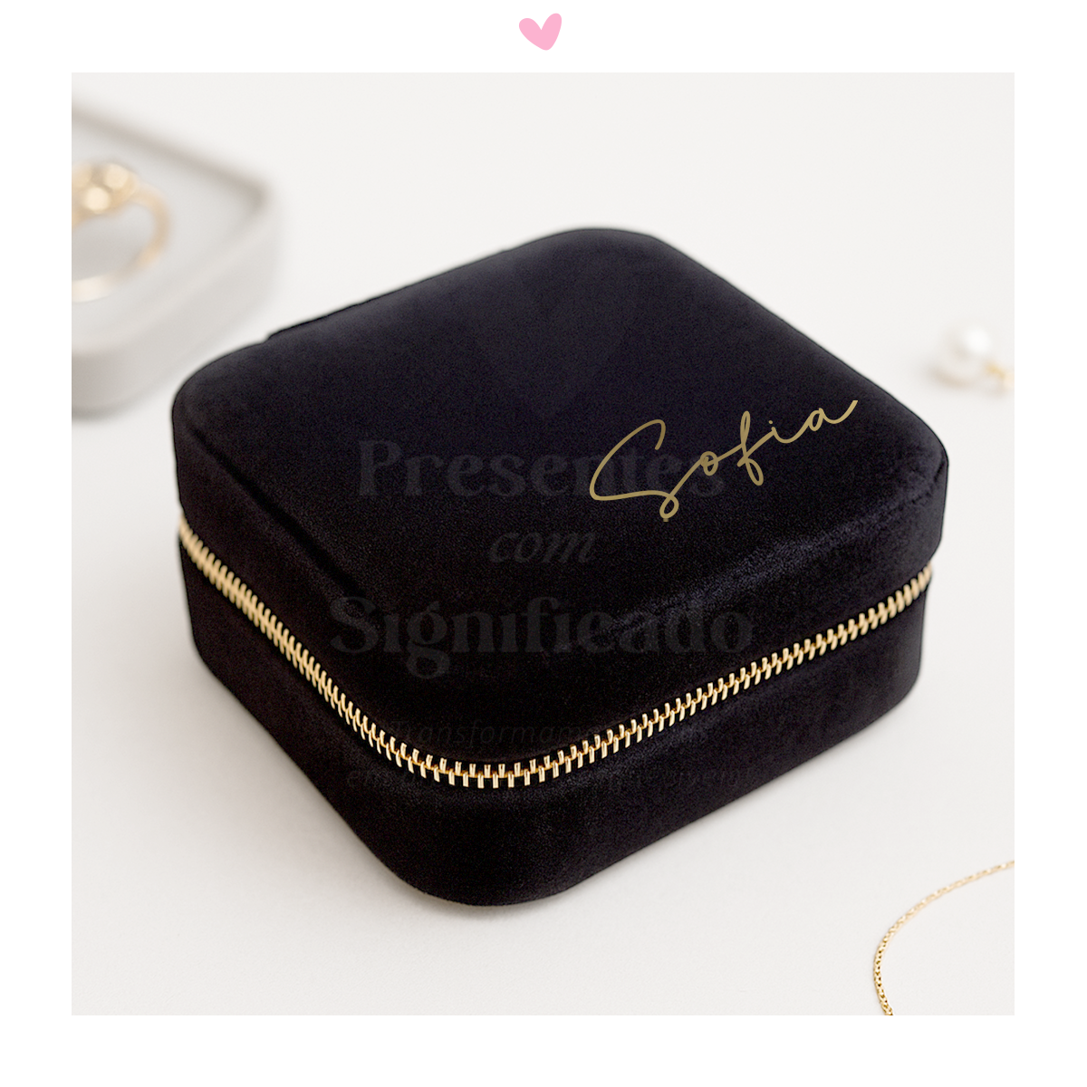 Mini-Guarda-jóias em veludo preto com divisórias para guardar anéis, brincos, colares... Personalizado com nome, data ou texto até um máximo de 5 palavras.
