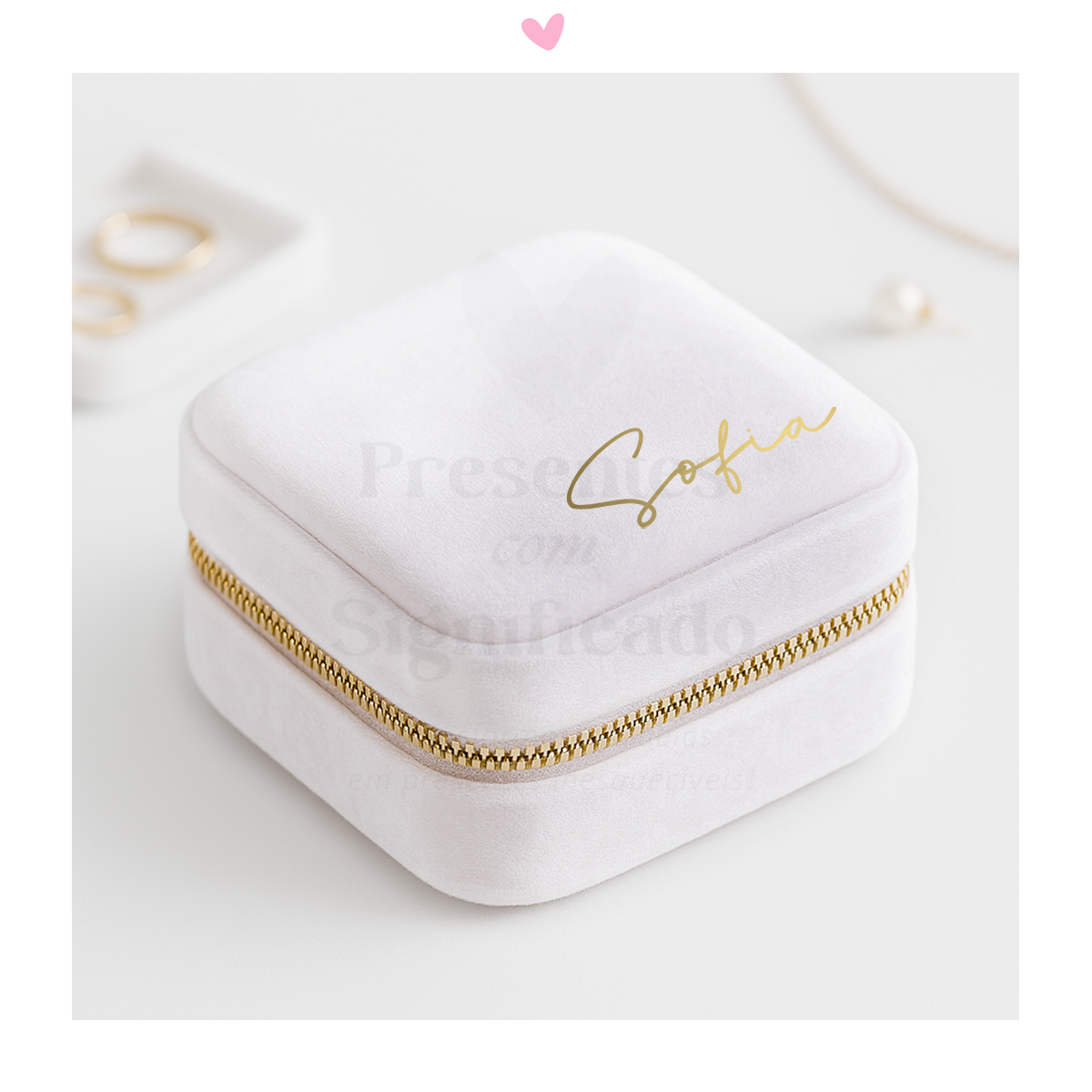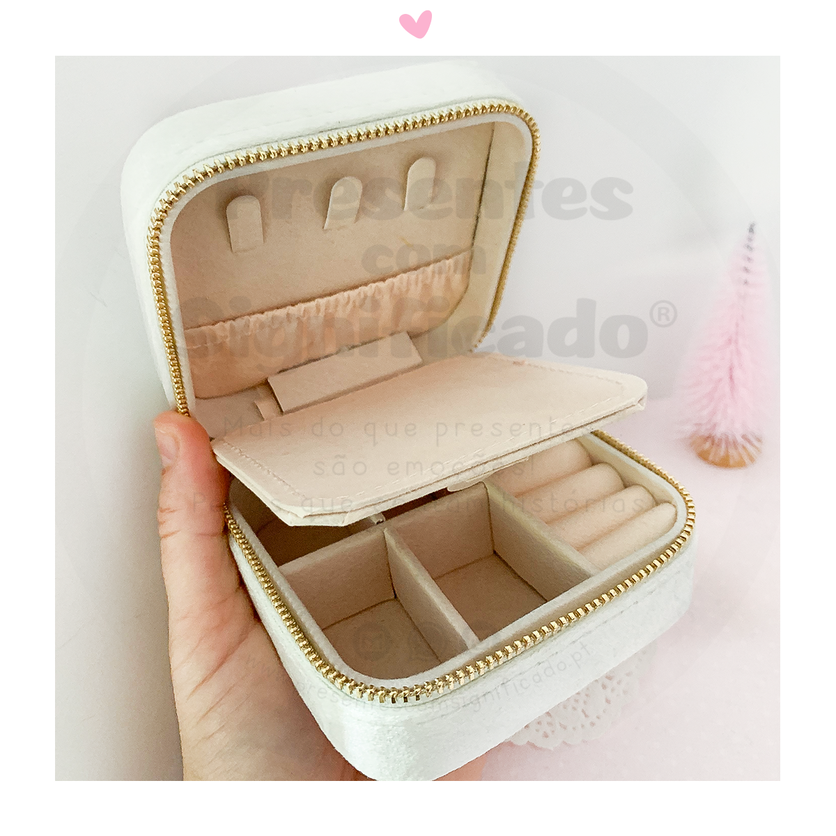 Mini Guarda-jóias em veludo cor branco com divisórias para guardar anéis, brincos, colares... Personalizado com nome, palavra, data ou texto até um máximo de 5 palavras.