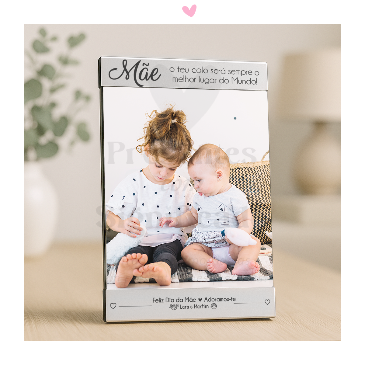 Moldura em alumínio e vidro disponível em 3 tamanhos: 15x10cm, 18x13cm e 20x15cm c/ foto colocada e gravação a gosto.