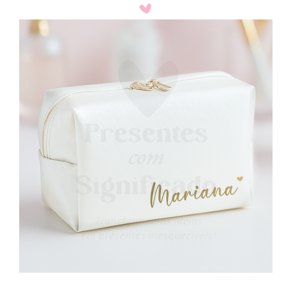 Necessaire em polipele de cor branco ligeiramente metalizado. Possui 2 fechos dourados a combinar com a cor da personalização. Idealmente deve ser feito com nomes ou frase muito curtas. Disponível 2 tamanhos.