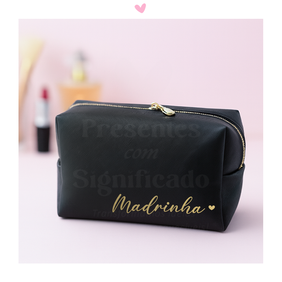 Necessaire em polipele de cor preto. Possui 2 fechos dourados a combinar com a cor da personalização. Idealmente deve ser feito com nomes ou frase muito curtas. Disponível 2 tamanhos.
