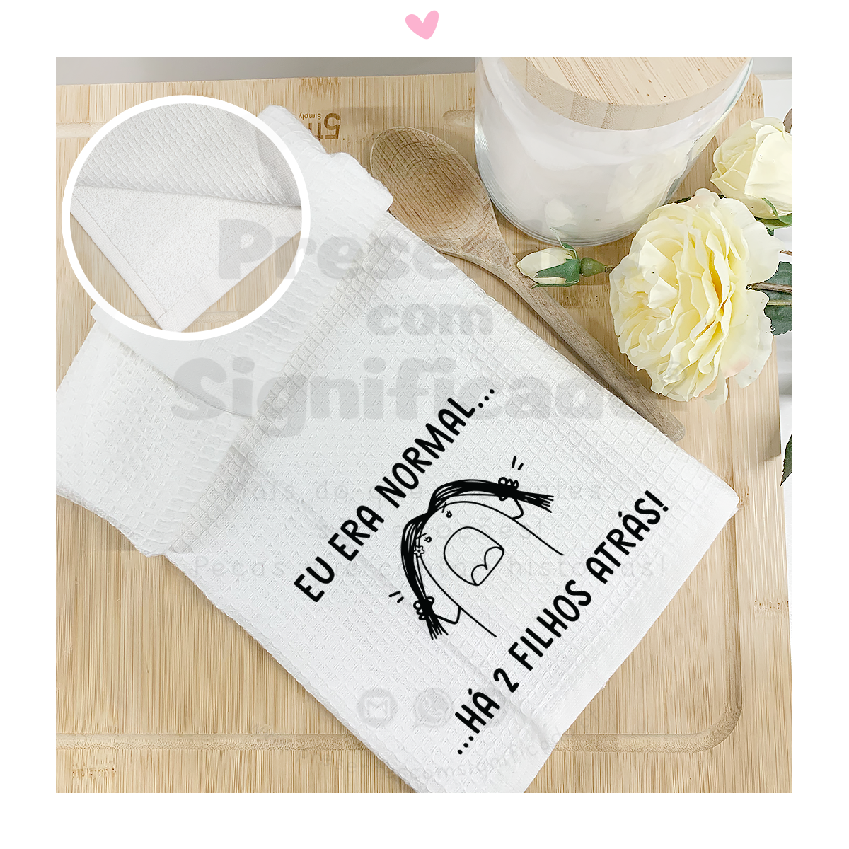 Pano de cozinha em tecido 100% algodão de fabrico nacional com padrão favo de mel de um lado e tecido turco do outro. Personalizado com texto "Eu era normal há X filhos atrás...". Possivel adicionar nomes/datas ou personalizar com outros textos.