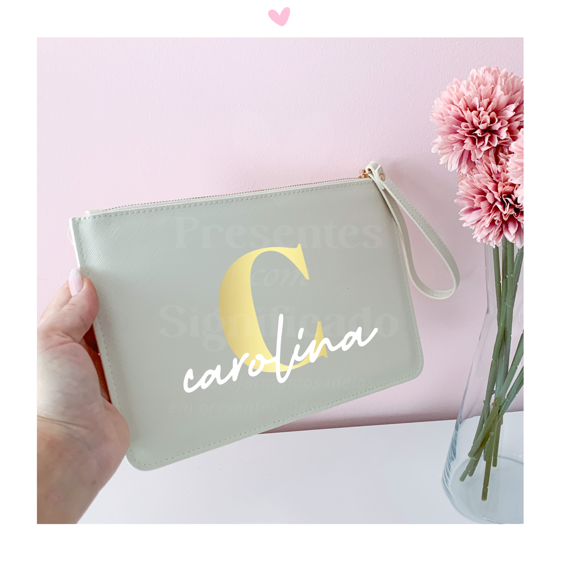 Pochete em polipele de qualidade premium na cor bege com prendedor de pulso incluído no fecho. O fecho dourado a combinar com os detalhes da personalização.  Personalize com nome ou frase curta.