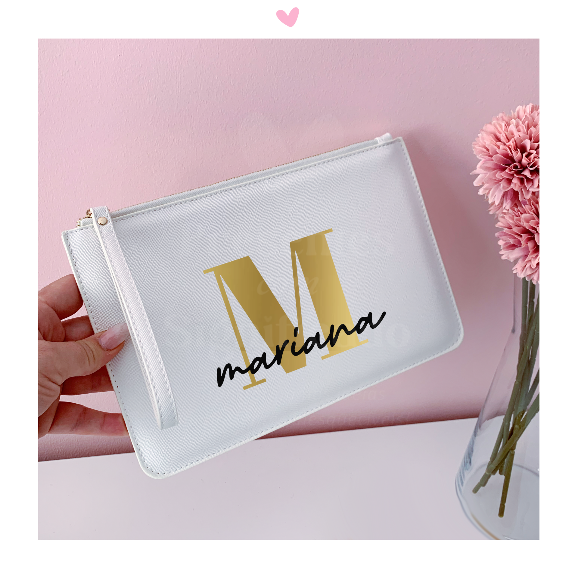 Pochete em polipele de qualidade premium na cor branca com prendedor de pulso incluído no fecho. O fecho dourado a combinar com os detalhes da personalização.  Personalize com nome ou frase curta.