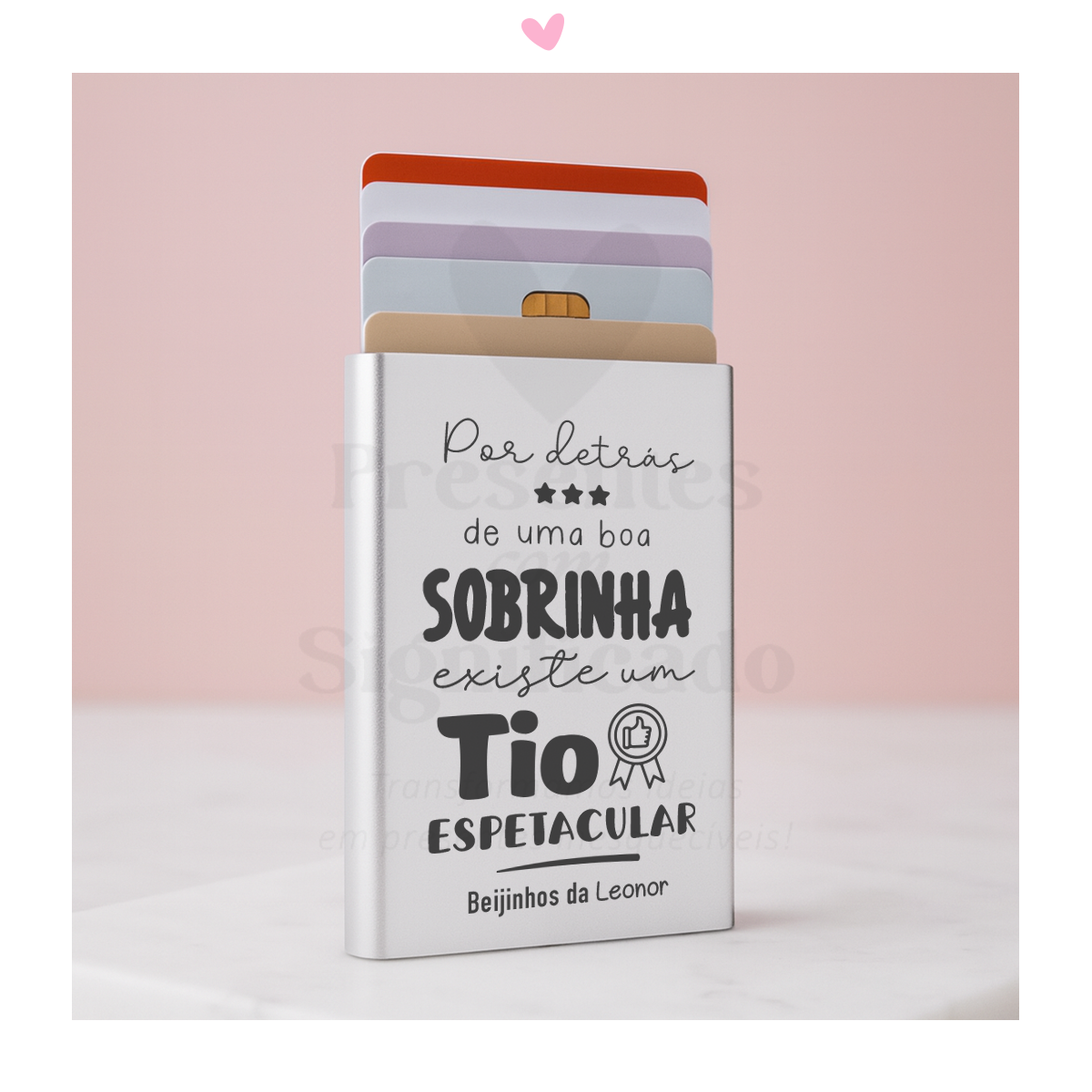 Porta-cartões RFID em alumínio com botão push (os cartões "saltam" do interior). Gravação personalizada a seu gosto. Capacidade para 10 cartões tipo MB.