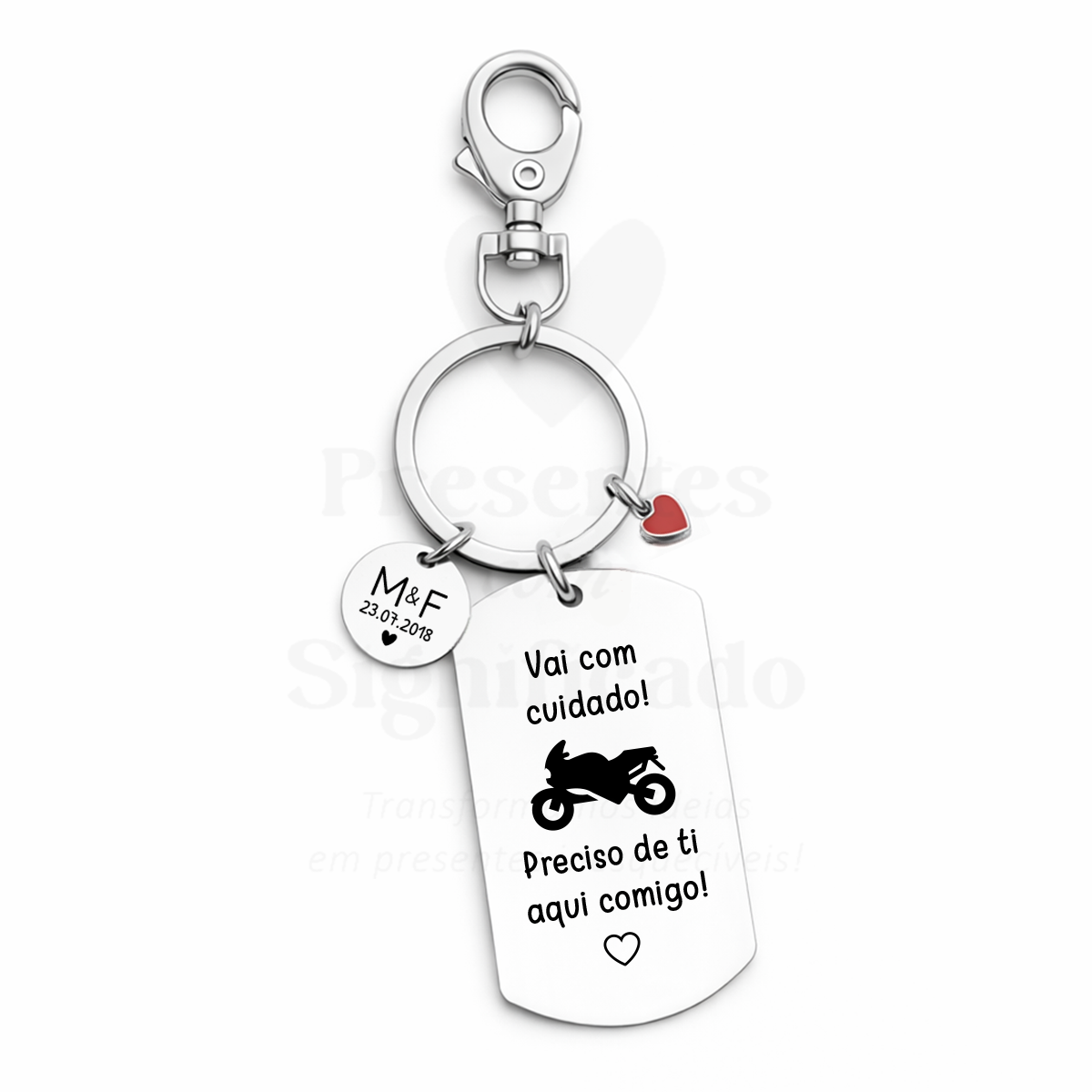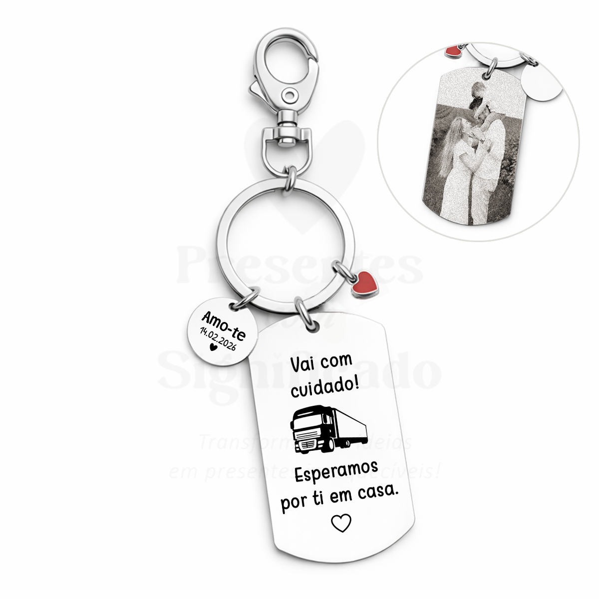 Porta-chaves simples com chapa de aço inox. retangular gravada e gancho para prender. Possível adicionar fotografia gravada no verso (deve assinalar essa opção, caso contrário não será considerada a foto).