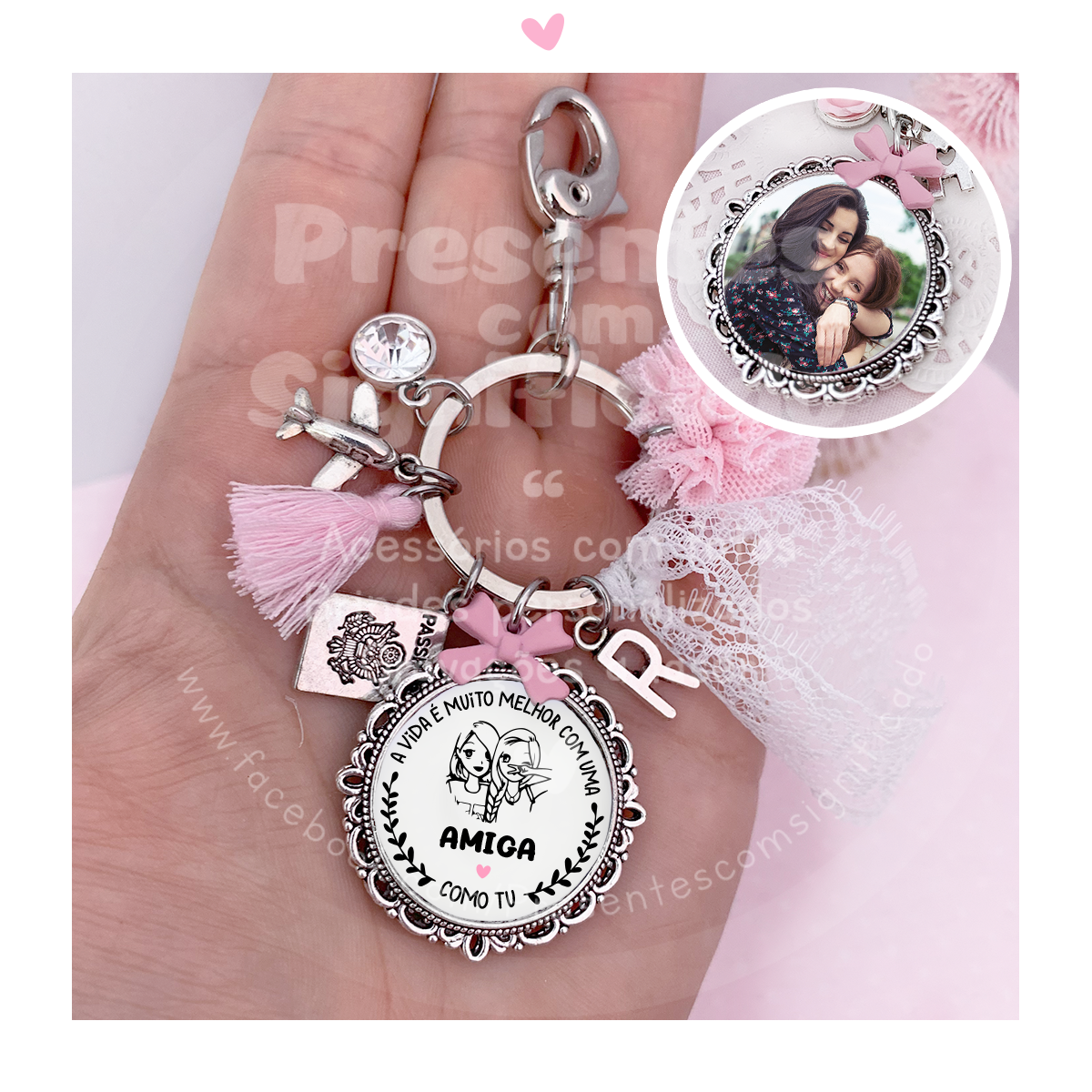 Porta-chaves de metal c/ medalha frente e verso (foto + texto), pompom de tule, rendinha, pendentes (máx. 3) e gancho para prender.