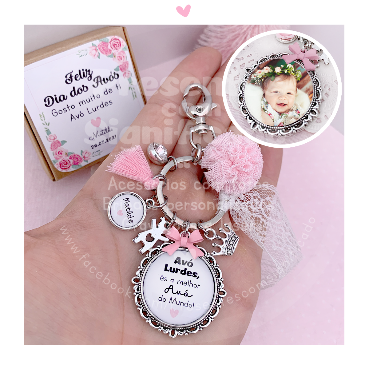 Porta-chaves de metal c/ medalha frente e verso (foto + texto), pompom de tule, rendinha, pendentes (máx. 3) e gancho para prender.