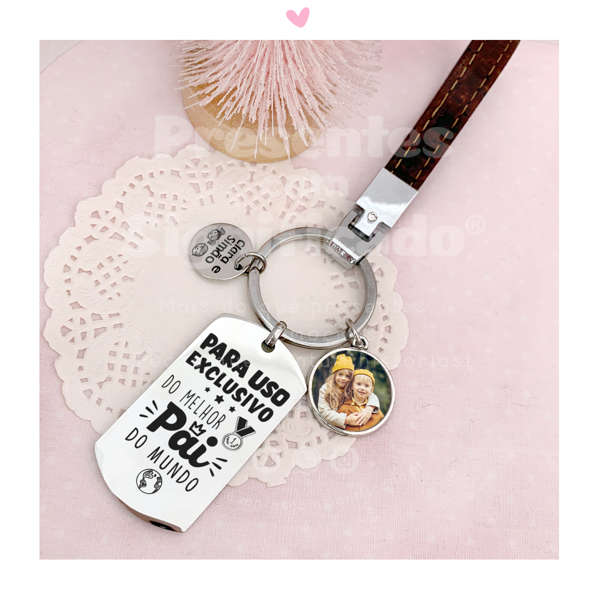 Porta-chaves com fita de imitação de couro, chapa de aço inox. retangular gravada a gosto, foto e pendente gravado.