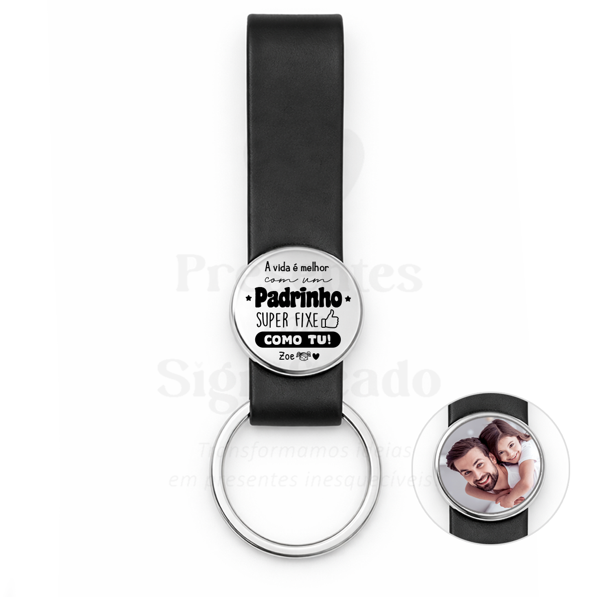 Porta-chaves com fita em silicone e entremeio de metal grosso c/ gravação personalizada de um lado e foto (ou outro texto) do outro.
