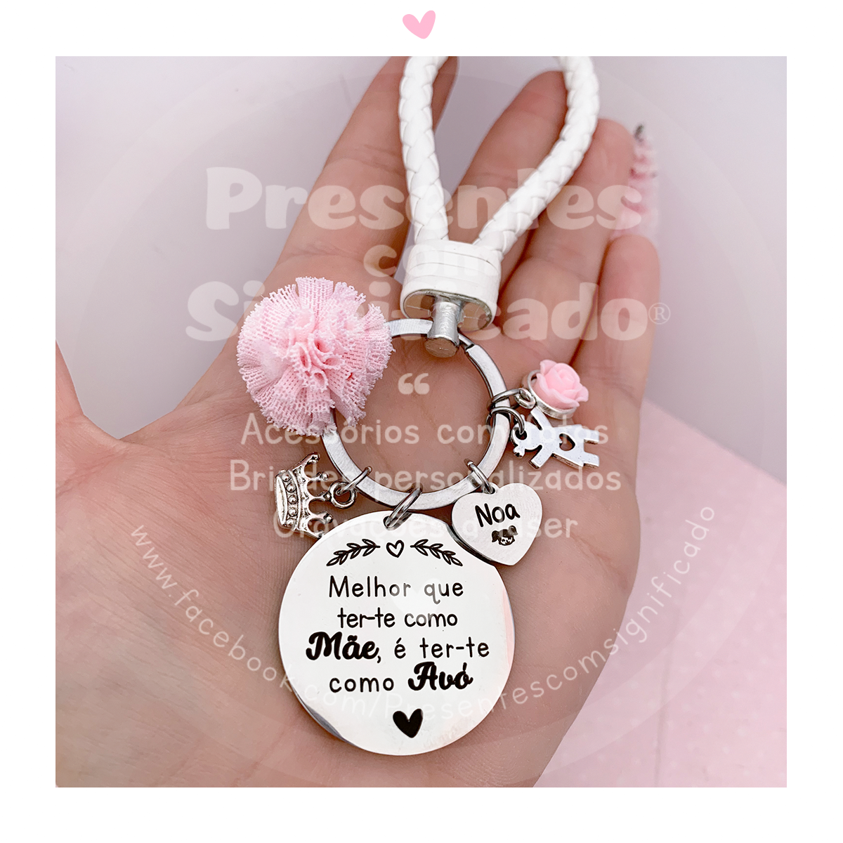 Porta-chaves em metal com fita tipo couro, decorado com chapa grande gravada a seu gosto, até 3 pendentes (veja a lista) e pompom de tule colorido.