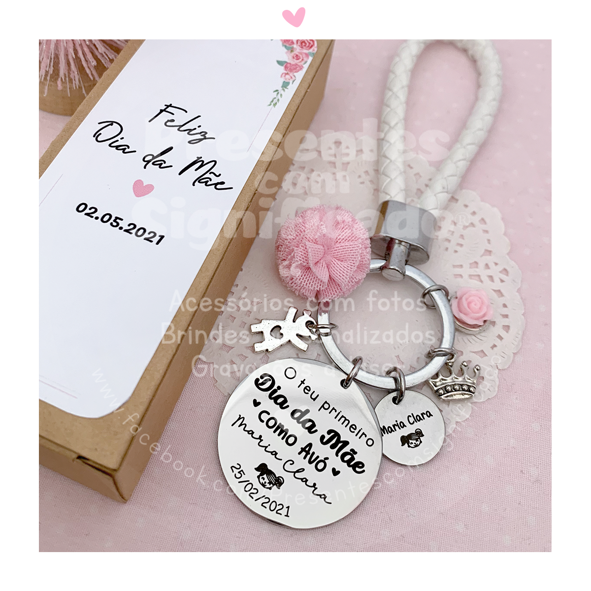 Porta-chaves em metal com fita tipo couro, decorado com chapa grande gravada a seu gosto, até 3 pendentes (veja a lista) e pompom de tule colorido.