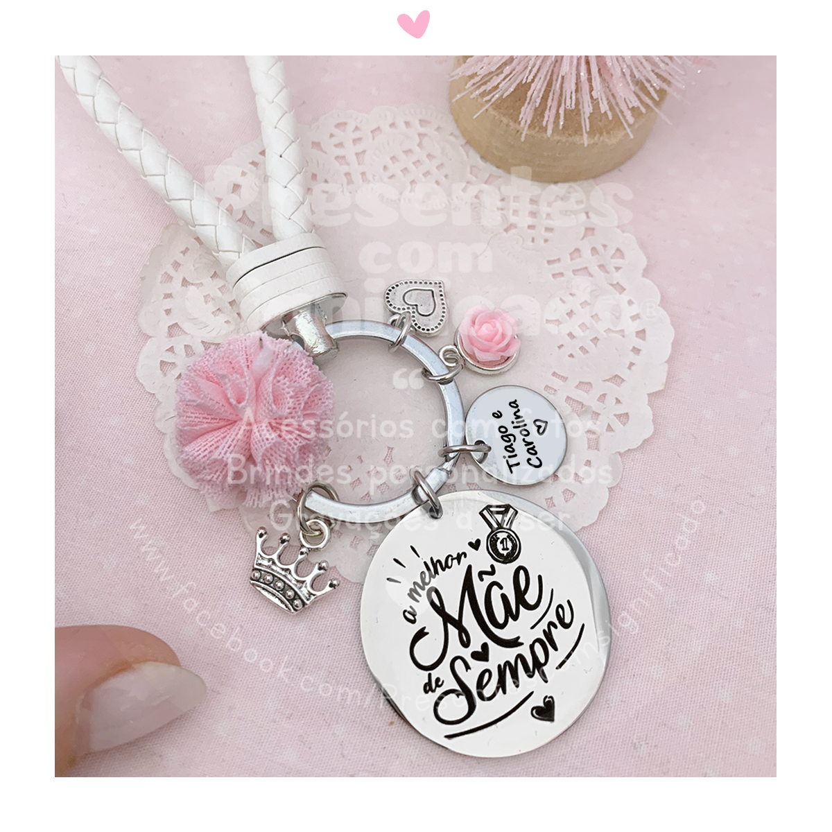 Porta-chaves em metal com fita tipo couro, decorado com chapa grande gravada a seu gosto, até 3 pendentes (veja a lista) e pompom de tule colorido.