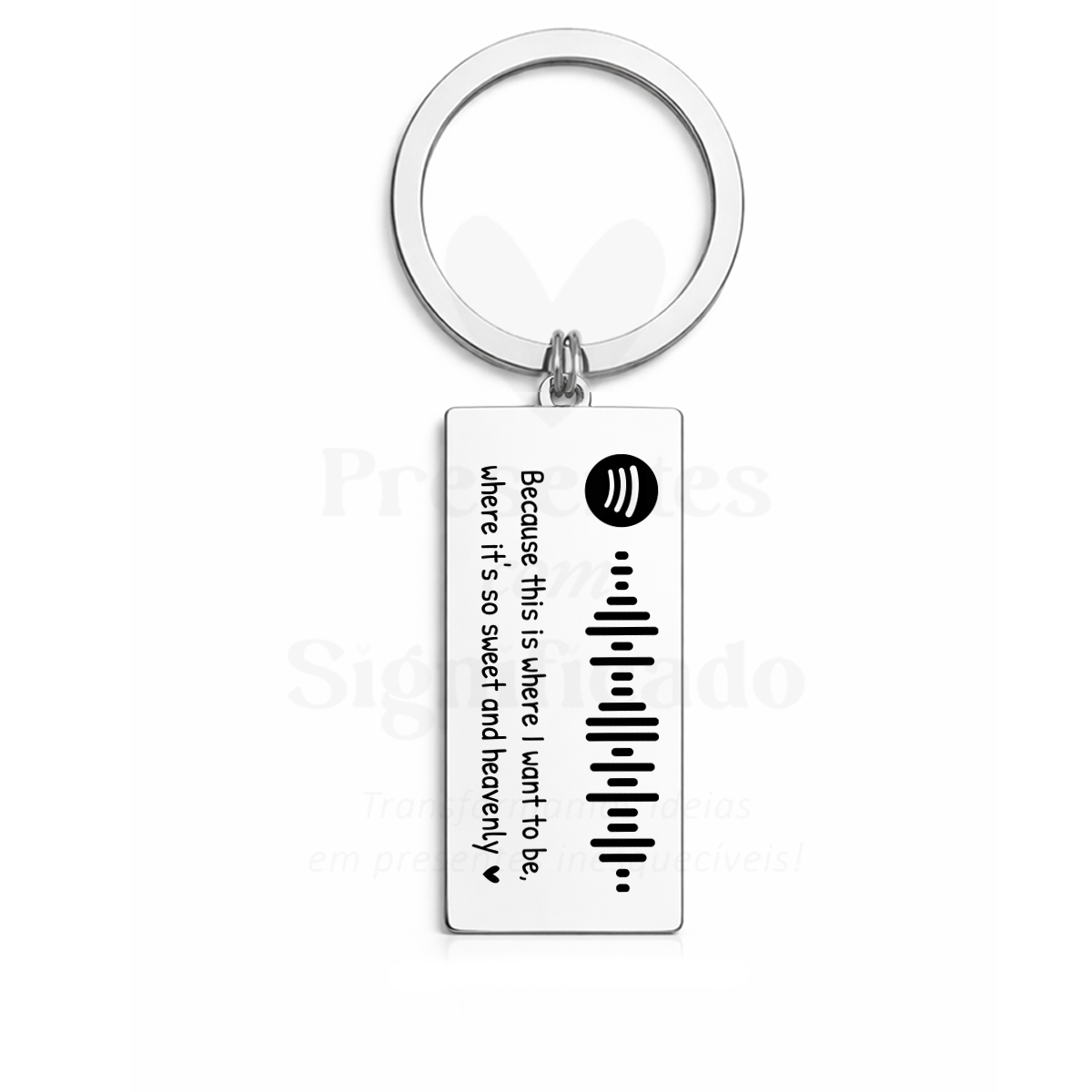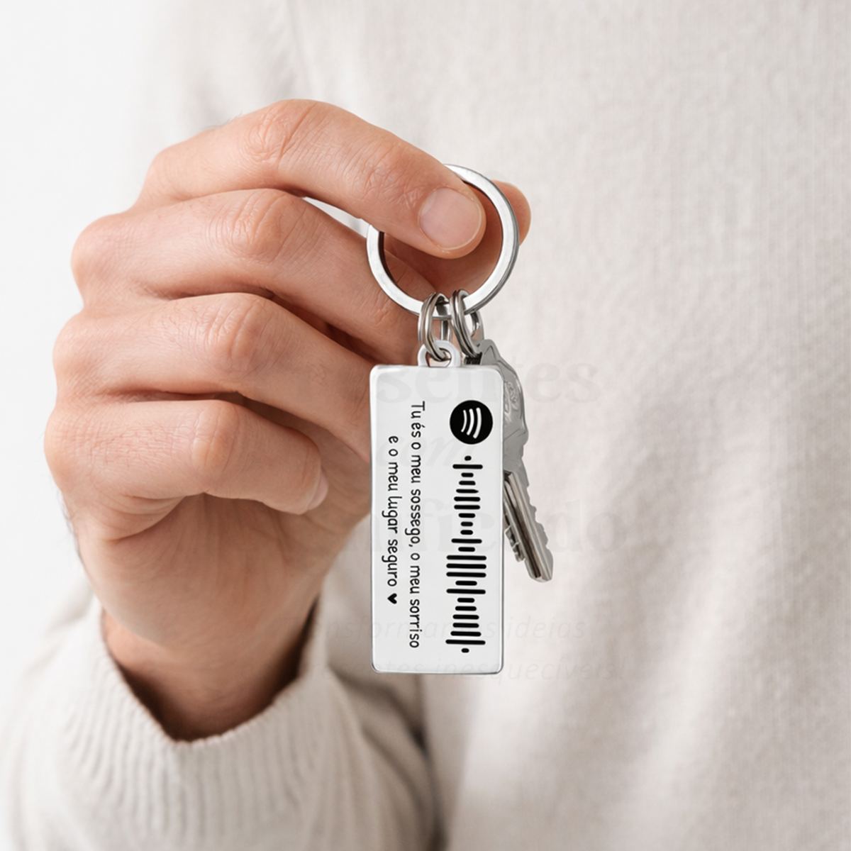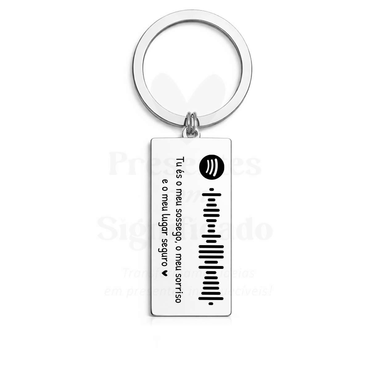 Porta-chaves em aço inox. c/ chapa retangular gravada com código Spotify de uma música à sua escolha (indique a música no campo de personalização). Pode acrescentar também frase/datas, etc... Para colocar a música a tocar basta: