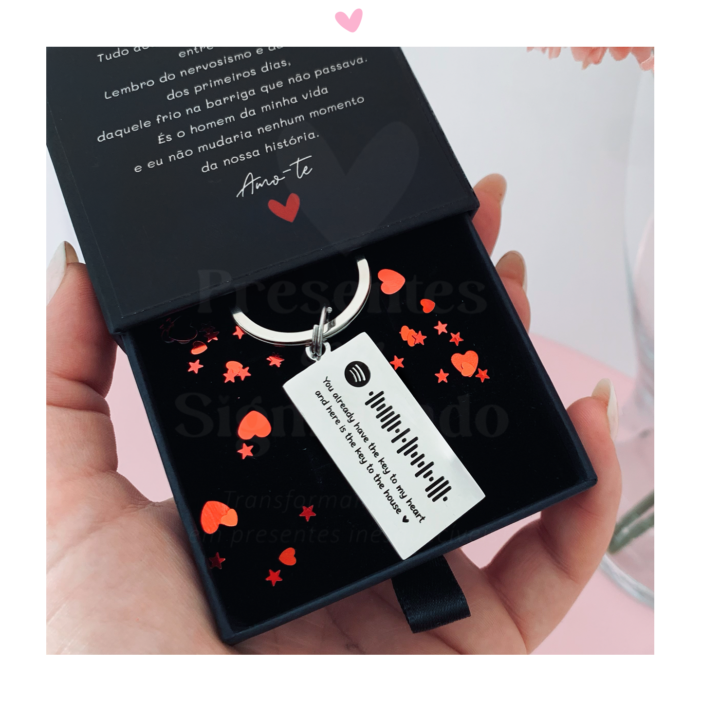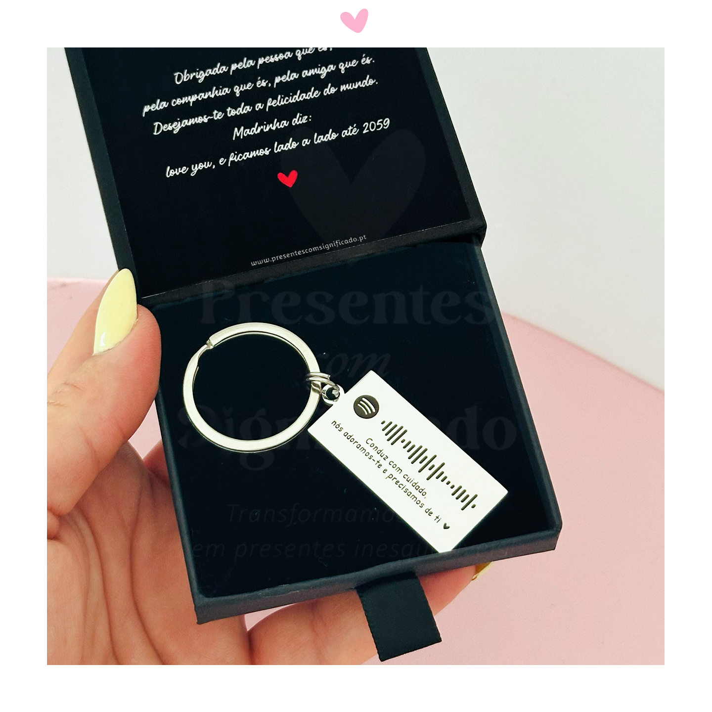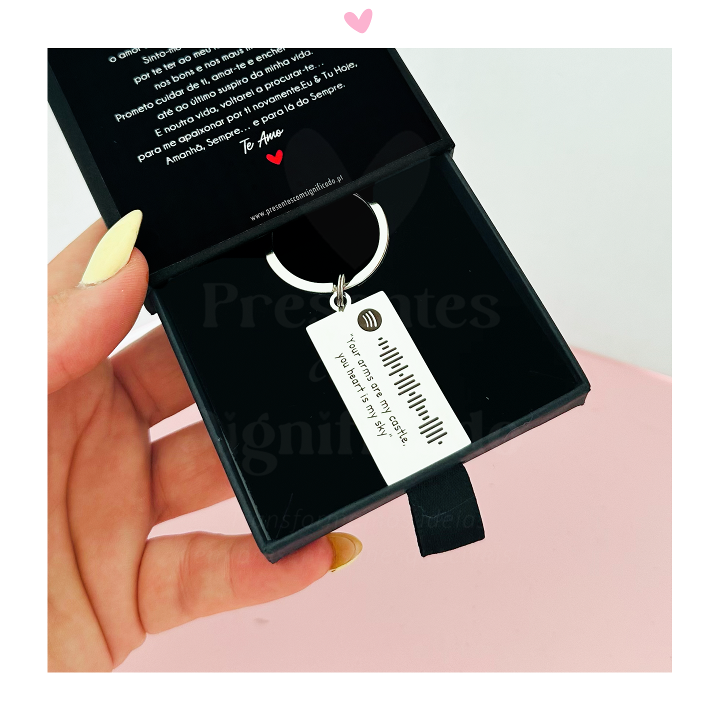 Porta-chaves em aço inox. c/ chapa retangular gravada com código Spotify de uma música à sua escolha (indique a música no campo de personalização). Pode acrescentar também frase/datas, etc... Para colocar a música a tocar basta: