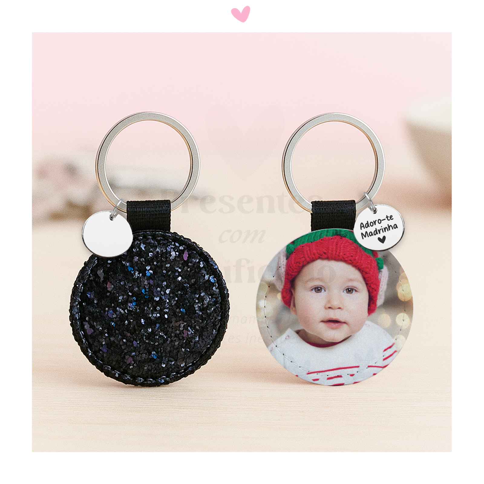 Porta-chaves simples redondo em tecido tipo nylon com estampagem de foto e pendente pequeno personalizado. O verso tem glitter texturado de cor preta (existe também em rosa). É um porta-chaves leve, ideal para usar junto com as chaves de casa.