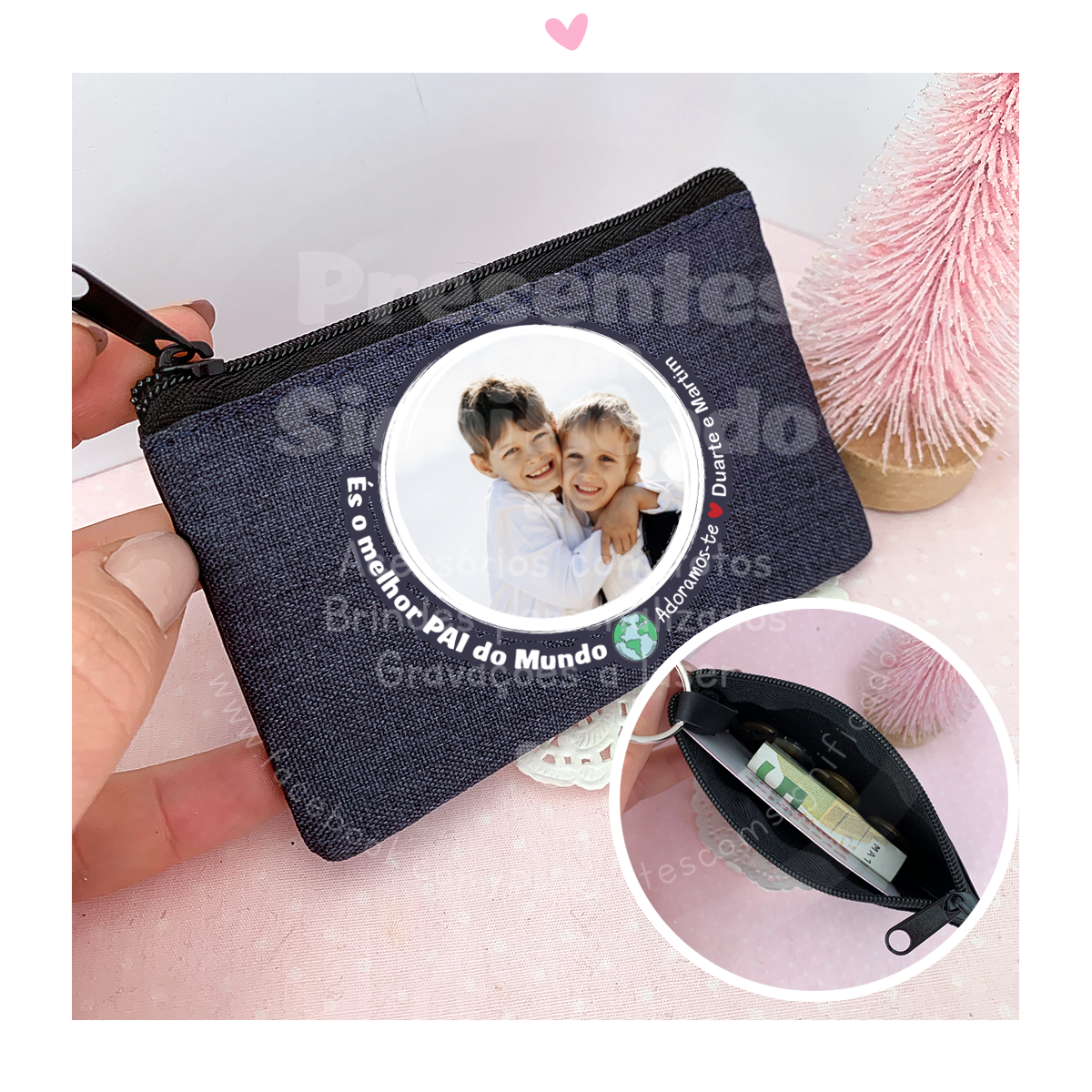 Porta-moedas em tecido tipo ganga e napa.Pode personalizar com foto e texto