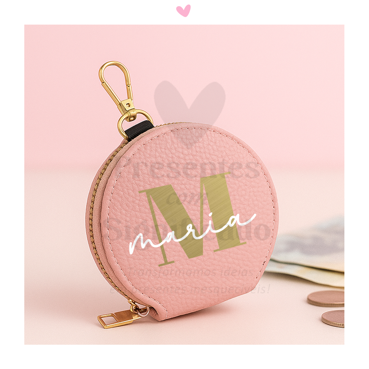 Porta-moedas de cor rosa com divisória interior. Personalizada com nome/inicial ou texto até 5/6 palavras. Disponível em 7 cores.