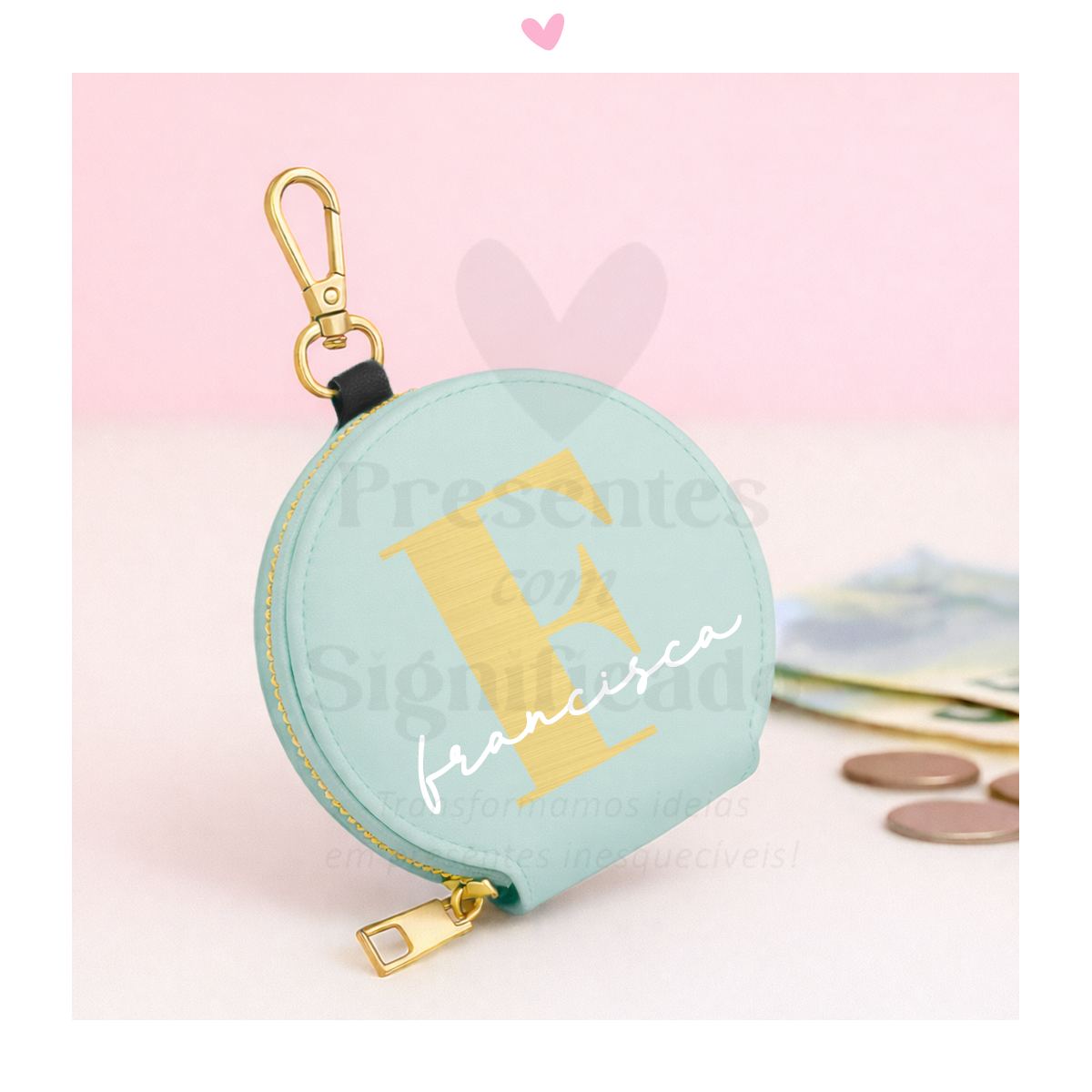 Porta-moedas verde água com divisória interior. Personalizada com nome/inicial ou texto até 5/6 palavras. Disponível em 7 cores.